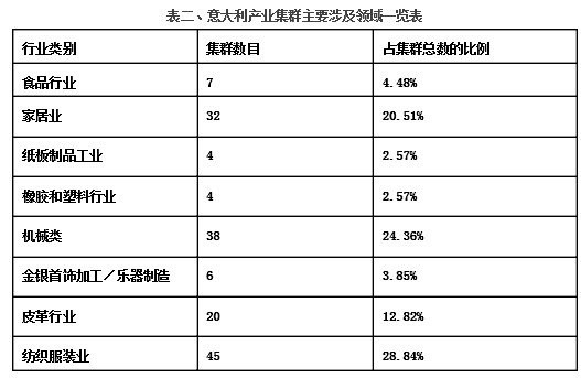 意大利的产业集群多集中在传统轻工业领域,主要行业及所占比例见表二。