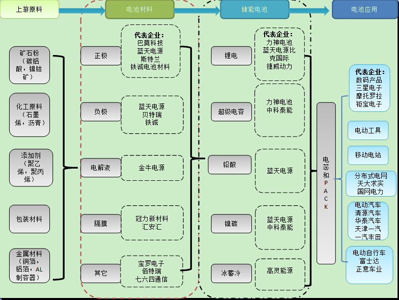 集群内部产业链条不断完善。知名企业云集,其中包括国内高端的自主品牌——力神电池;全球最大的锂离子电池负极材料供应商——贝特瑞;国内最大的锂离子电池正极材料提供商——巴莫科技;国内最大的电解液生产企业——天津金牛。依托这些龙头企业,又陆续引进了高灵能源蓄能产业基地、冠力锂电池隔膜、汇安汇锂电池隔膜、中科泰能镍碳超级电容器、天传能源检测设备等企业。并且围绕龙头企业培育了一批科技型中小企业,使集群的产业链条进一步完善。