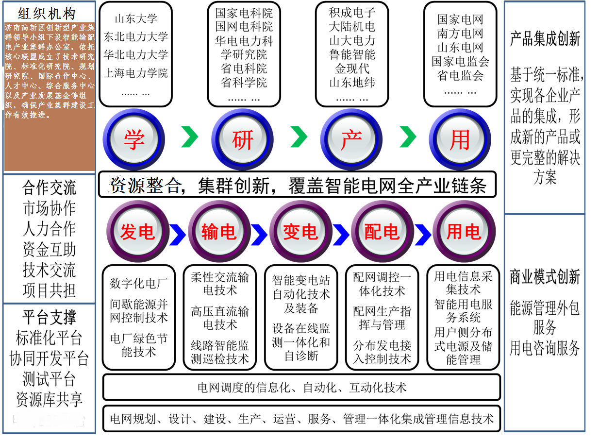 山东是电力大省,济南高新区的智能电网输配电装备产业是伴随着山东电力工业的信息化、自动化、数字化需求逐渐发展起来的。济南高新区聚集了大批智能输配电二次设备及其他智能电网装备研发生产企业,这些企业早在2004年就在高新区齐鲁软件园自发形成了“齐鲁电力软件企业联盟”,其成功的协同创新模式曾被中央电视台专题报道。经过十几年的产业聚集和发展,济南智能输配电产业走在了国内前列,特别是在智能电网变、配产业中的规模和优势尤为明显。产品基本覆盖了电力一次设备和电力工业二次设备中发电领域的生产过程自动化、制造执行及管理决策,输变、配电领域的电网调度自动化、变电站综合自动化、配电自动化及配电管理以及用电管理,成为我国较有影响力的智能电网变、配装备研发、制造产业基地和技术研发中心之一,已经形成了门类齐全、产业链齐备、国内比较优势明显的产业体系,初步形成了以智能电网变电、配电装备为主、发电、输电、用电和智能微电网装备为辅的产业链,并成为济南市的优势产业与支柱产业。2013年被山东省列为山东省重点打造的千亿级产业集群。集群企业除了几个规模较大的智能电网输配电装备公司之外,还有一大批企业掌握着清洁能源、可持续能源技术,或电力智能化、自动化技术的中小科技企业,其比例约占集群内企业总数的82%。