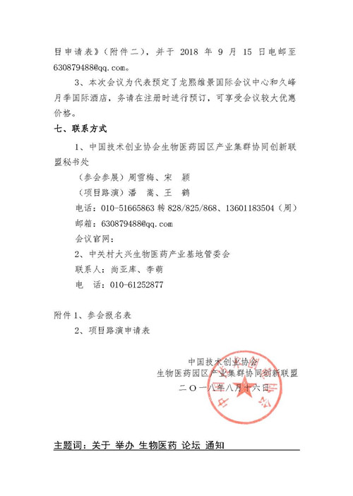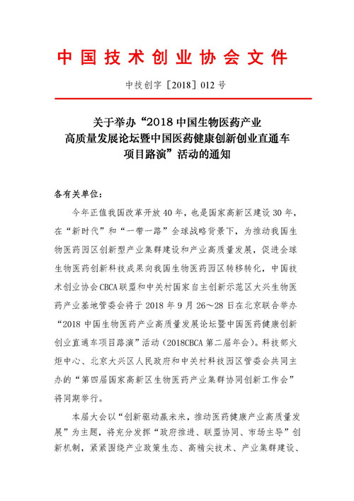 关于举办“2018中国生物医药产业高质量发展论坛暨中国医药健康创新创业直通车项目路演”活动的通知