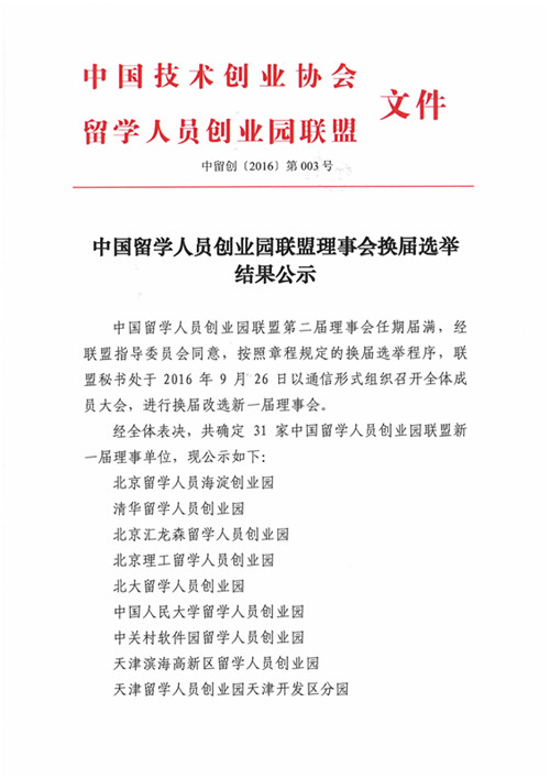 中国留学人员创业园联盟理事会换届选举结果公示