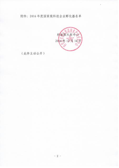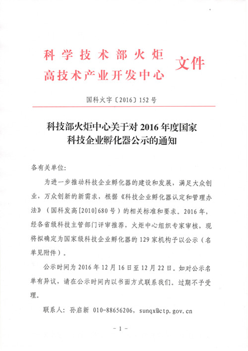 科技部火炬中心关于对2016年度国家级科技企业孵化器公示的通知