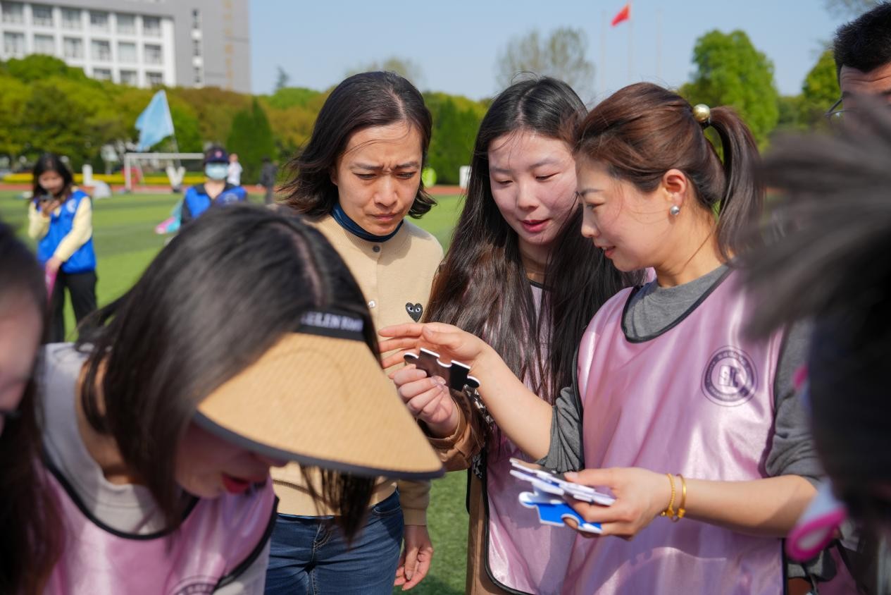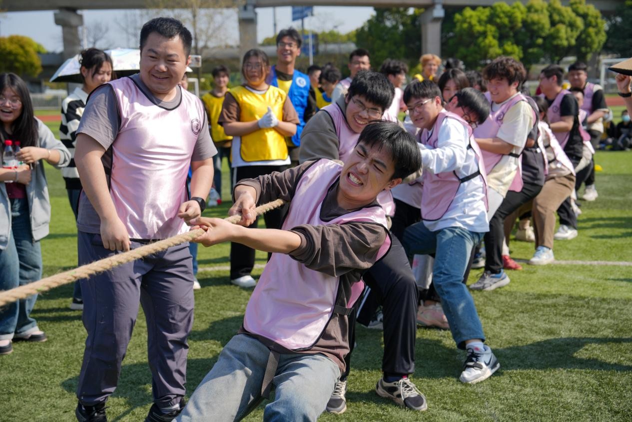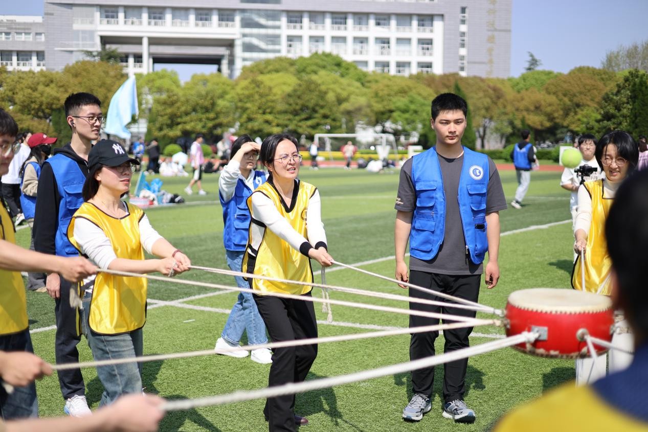 “头头拍拍”、“右脚尖右脚尖拍拍”、“左边大腿拍拍”,活动以学生自行设计和配音的“变速拍拍操”作为热身拉开运动帷幕。在逐渐加速的律动下,领操学生们活力满满,带动所有人唤醒自己的身体、点燃心中的热情。比赛环节共设置五个各具特色的项目,融合了趣味性、教育性和实践性。从“同心鼓”到拔河,从多人飞盘到院徽拼图,将“以体育人”作为切入口,把思政课堂从教室搬上了操场。这个展现自我的舞台,不仅提升了学生的情绪状态、促进了身心发展,更培养了他们的团队协作精神和集体荣誉感。