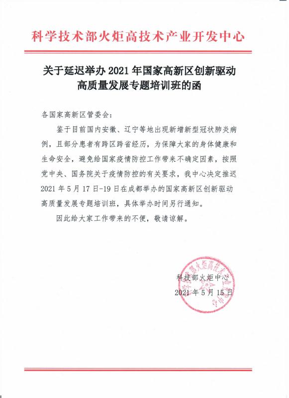 关于延迟举办2021年国家高新区创新驱动高质量发展专题培训班的函