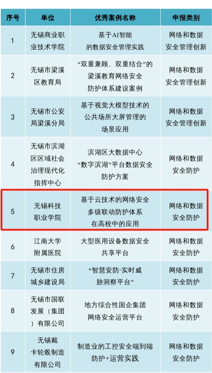 近日,无锡市网络和数据安全优秀实践案例评选结果公布。我校提交的案例《基于云技术的网络安全多级联动防护体系在高校中的应用》成功入选2024年无锡市网络和数据安全优秀实践案例。