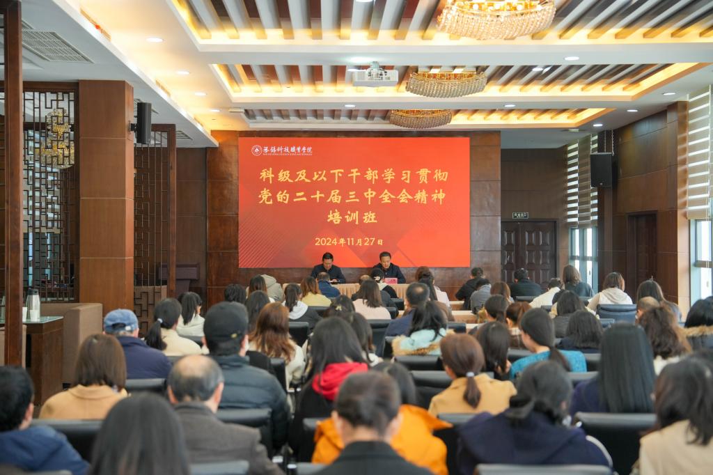 为推动党的二十届三中全会精神在学校落地落实,进一步提升学校科级干部的理论水平和综合素养,增强科级干部的凝聚力、战斗力和执行力,11月27日,学校科级及以下干部、党员学习贯彻党的二十届三中全会精神专题培训班开班。党委书记张国华作动员讲话,党委组织部部长胡光明主持开班式,学校正科职、副科职以及挂职干部参加开班式。