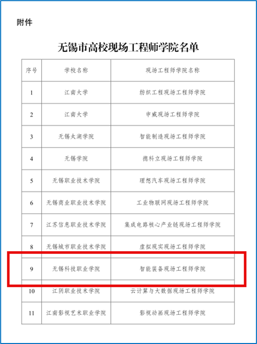 近日,无锡市教育局公布《市教育局关于公布无锡市高校现场工程师学院名单的通知(锡教函〔2024〕192号)》文件,我校智能制造学院与无锡高新区龙头企业无锡威孚高科技集团股份有限公司联合申报的智能装备现场工程师学院名列其中。