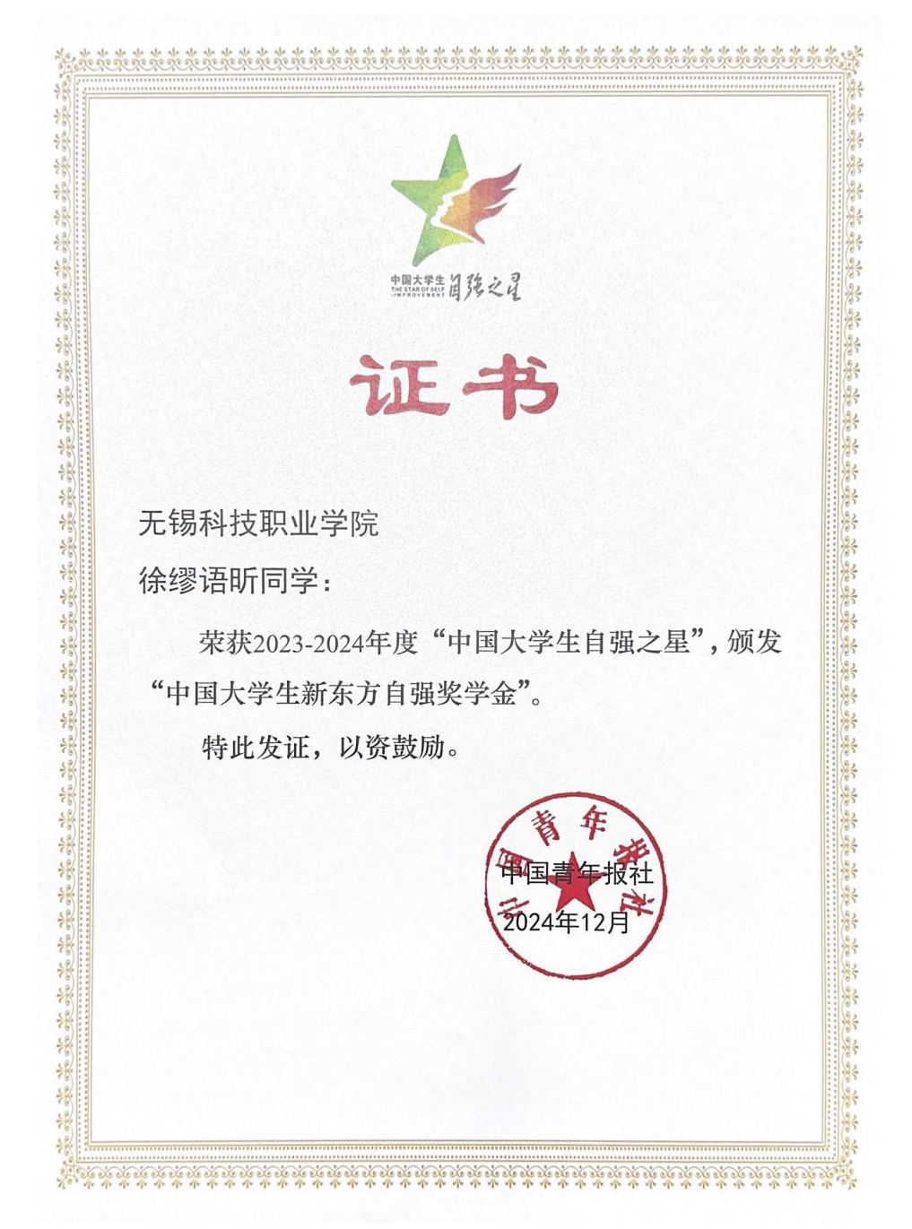 近日,由共青团中央、全国学联主办的2023—2024年度“中国大学生自强之星”评选结果揭晓,我校学生徐缪语昕荣获“中国大学生自强之星”称号,这是我校学子第二次获此殊荣。