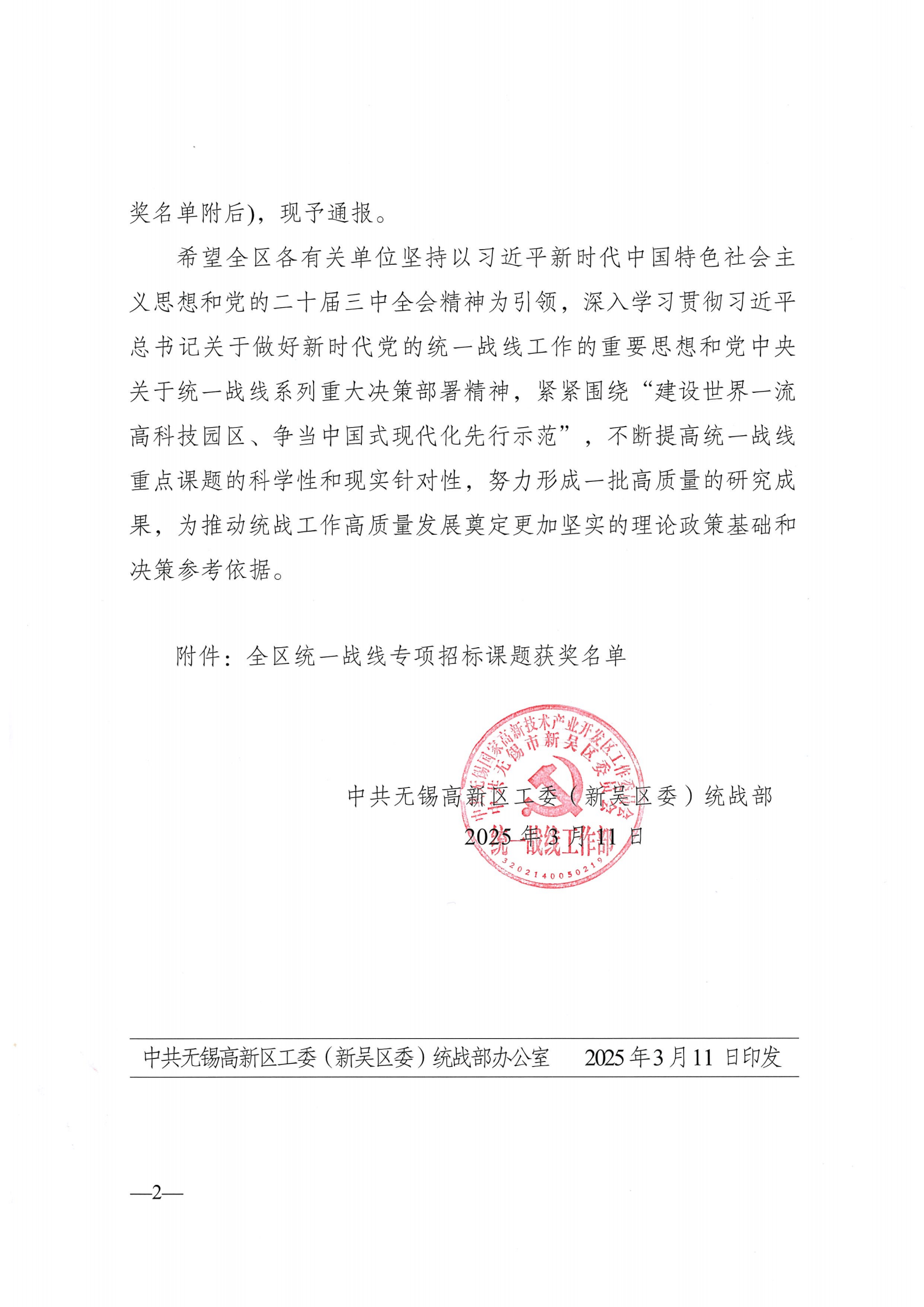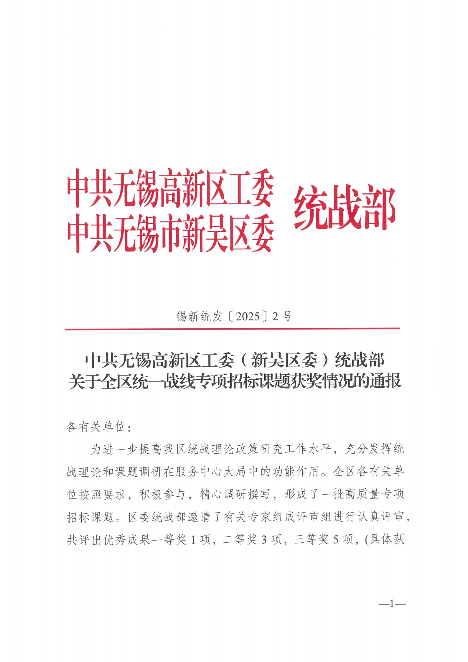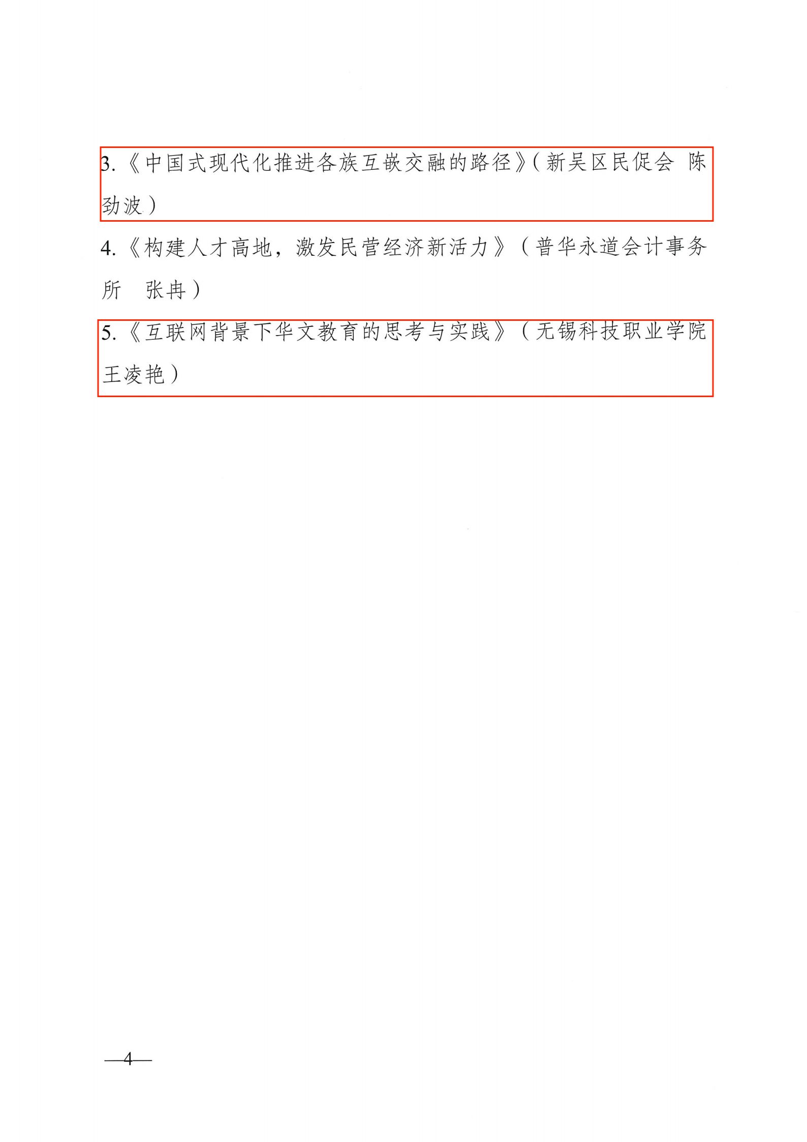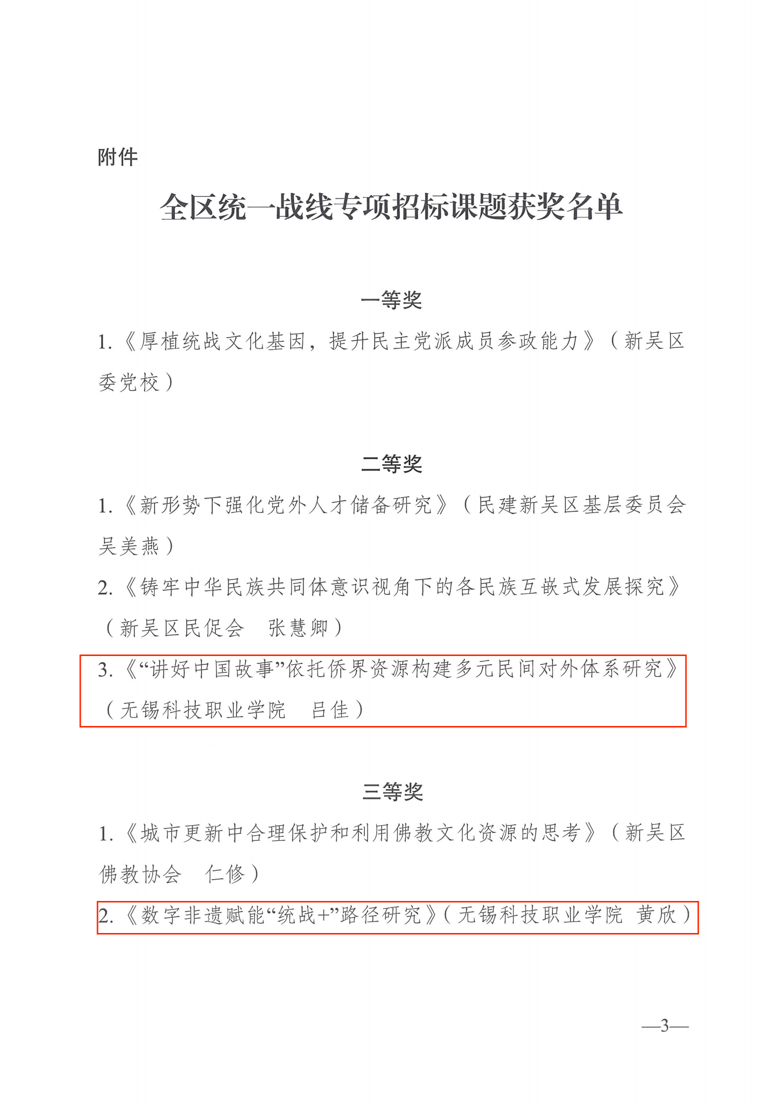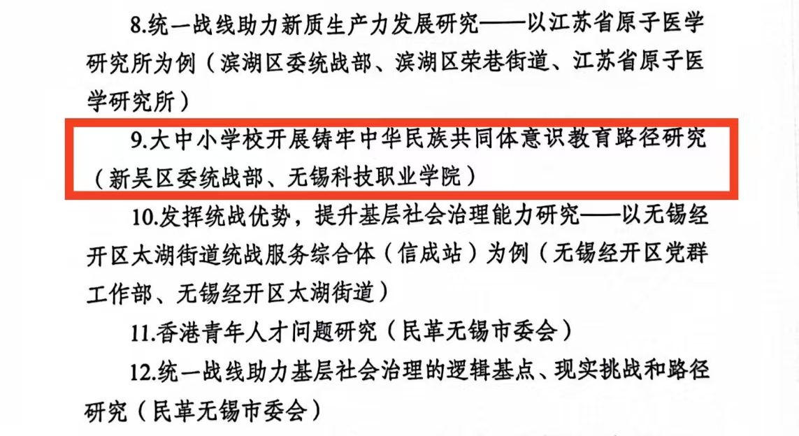 中共无锡高新区工委(新吴区委)统战部公布了《关于全区统一战线专项招标课题获奖情况的通报》,我校吕佳老师《“讲好中国故事”依托侨界资源构建多元民间对外体系研究》课题获得二等奖,黄欣老师《数字非遗赋能“统战+”路径研究》、陈劲波老师《中国式现代化推进各族互嵌交融的路径》、王凌艳老师《互联网背景下华文教育的思考与实践》分别获得三等奖。