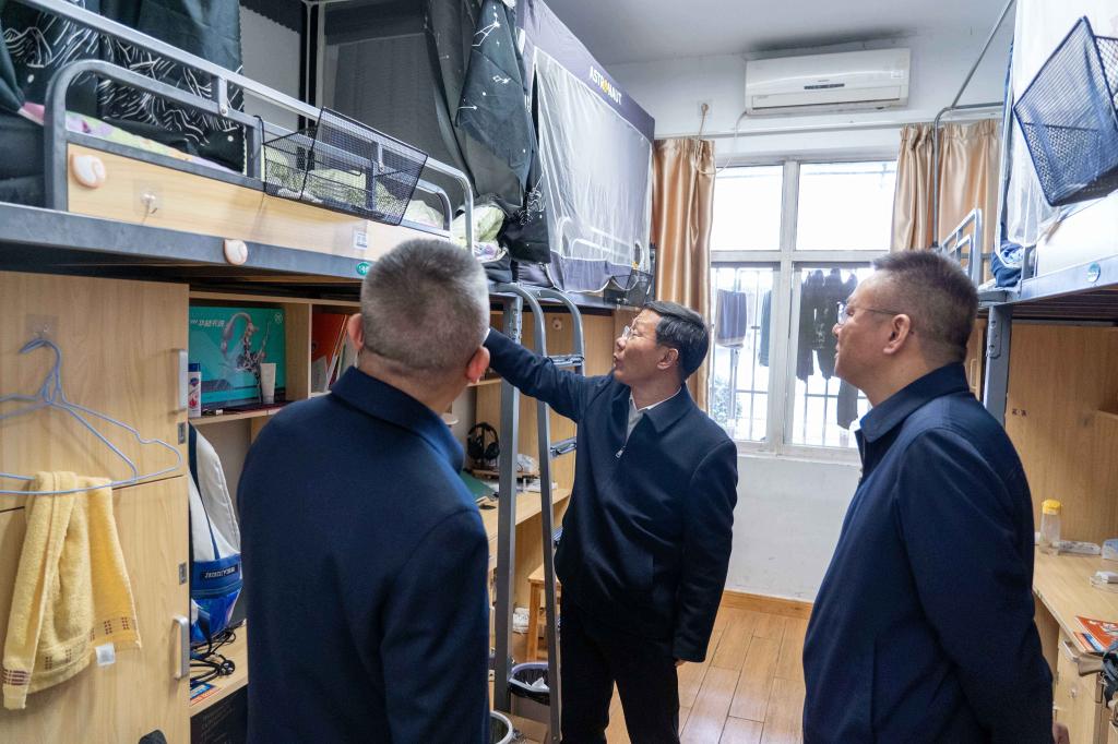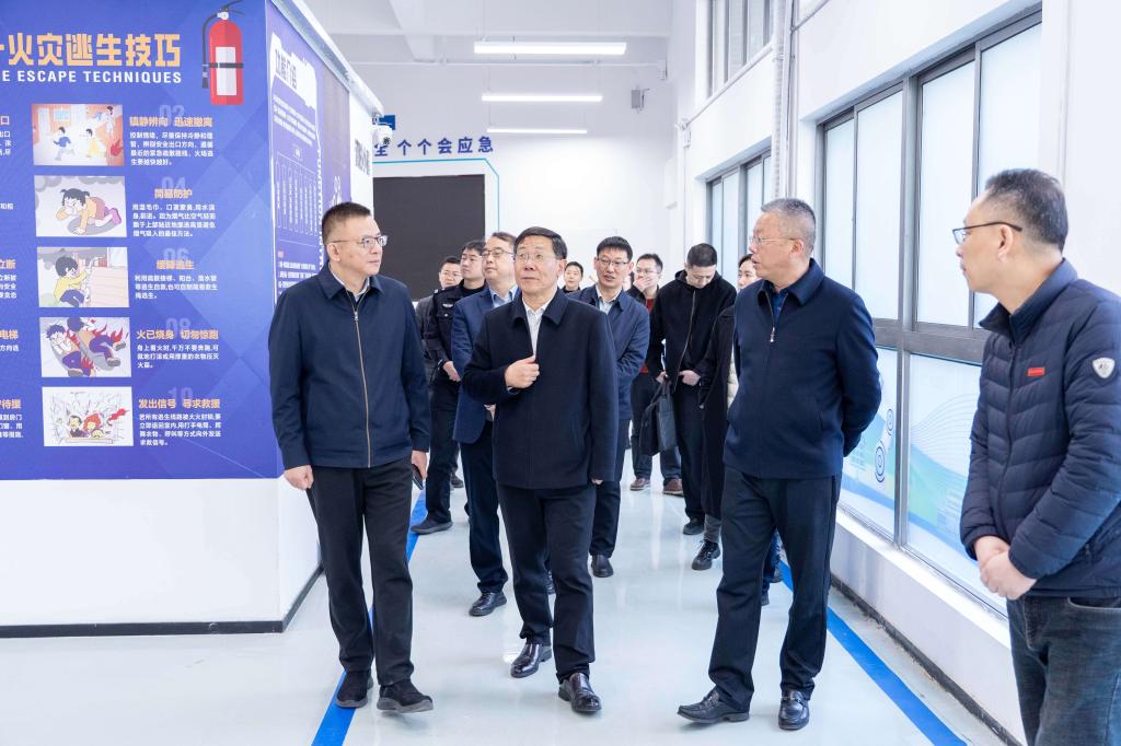 王庆春一行实地查看了学校南门门岗、值班室、学生宿舍、“一站式”学生社区管理中心、学校警务室、教育部工业机器人培养中心、高新区应急管理人才培养中心和智慧教室等的安全情况。