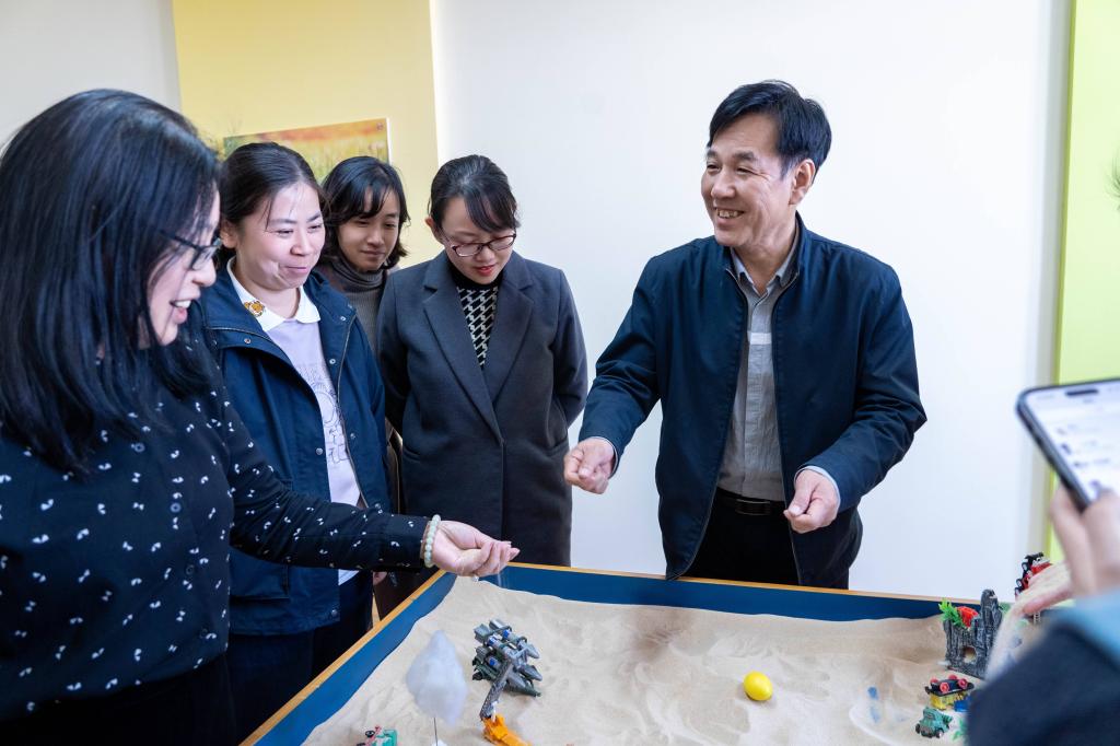 在大学生健康成长中心,考察组听取了我校“以学生为中心”的育人理念和“五育并举、润心成长”特色工作举措的汇报。刘宝民秘书长充分肯定了我校学生培养中的“大健康”工作思路,以及“以德育心、以智慧心、以体强心、以美润心、以劳健心”的具体做法。他说,面对新生代大学生,将心理健康教育和咨询服务全面渗透到教育教学全过程,将身心健康与学业进步、职业规划、美育劳育等方面有机融合,不仅能够提高育人质量,也是提升高校办学实力和水平的根本所在。