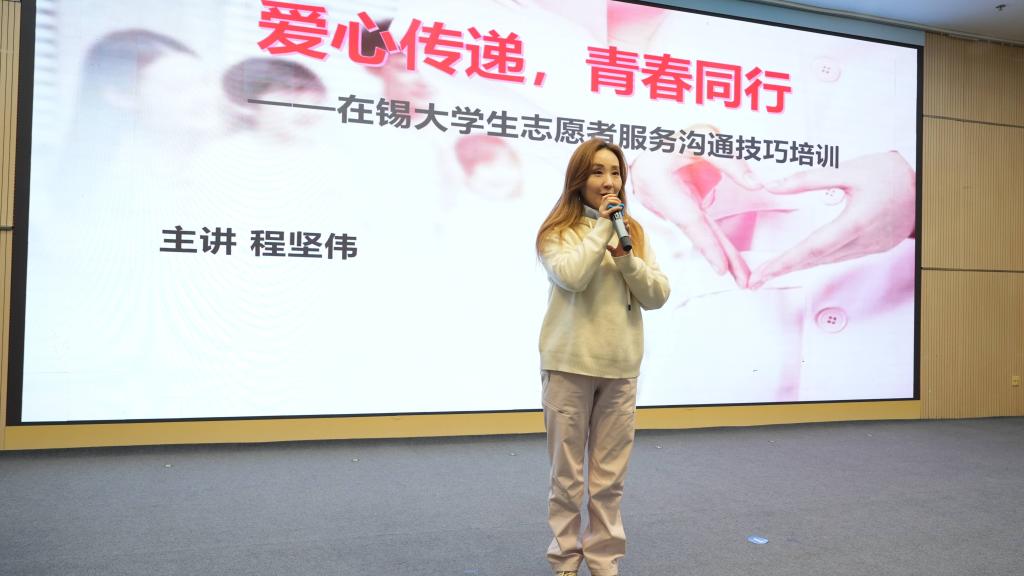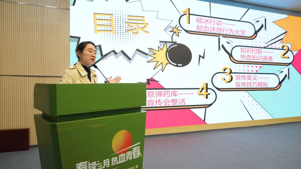 在活动的第二阶段,无偿献血宣讲员培训活动有序开展。市中心血站献血服务科许婧以“无偿献血宣传招募技巧”为主题,通过案例分析、情景模拟等形式,为同学们分享了志愿服务的进阶秘籍。活动还特邀国内211高校、一类本科高校心理中心特邀咨询师,团体指导师,中科院心理所心理健康指导师程坚伟,针对同学们在志愿服务中的心理调适需求进行专题辅导。