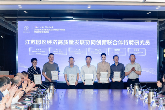 无锡市社科联党组书记、主席李明新为中国科学院科技战略咨询研究院中国高新区研究中心副主任杨斌,长江三角洲经济社会发展研究中心主任、教育部长江学者、南京大学博士生导师范从来教授,江苏省创新经济研究基地首席专家、江苏省民营经济研究基地首席专家、南京师范大学博士生导师蒋伏心教授颁发专家聘书。我校校长华裕良为来自高校和园区的研究员卢勇、郑江伟、吴琪、黄娇娇、蒋漱清、王岳龙六位研究员颁发聘书。未来江苏园区经济高质量发展协同创新联合体成员们将共同开展课题研究、政策咨询和产业服务。