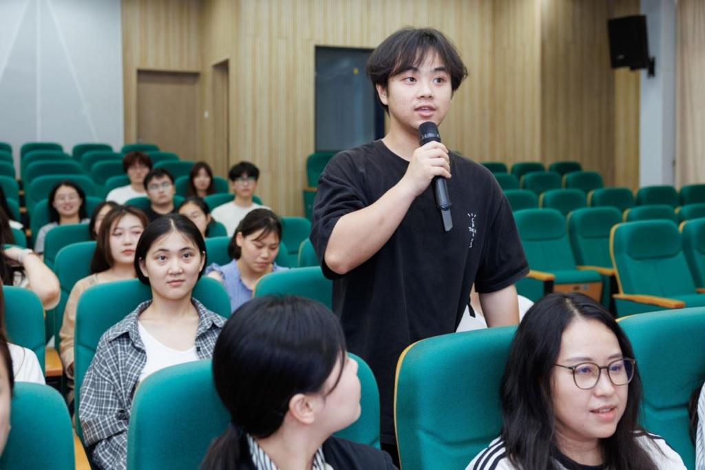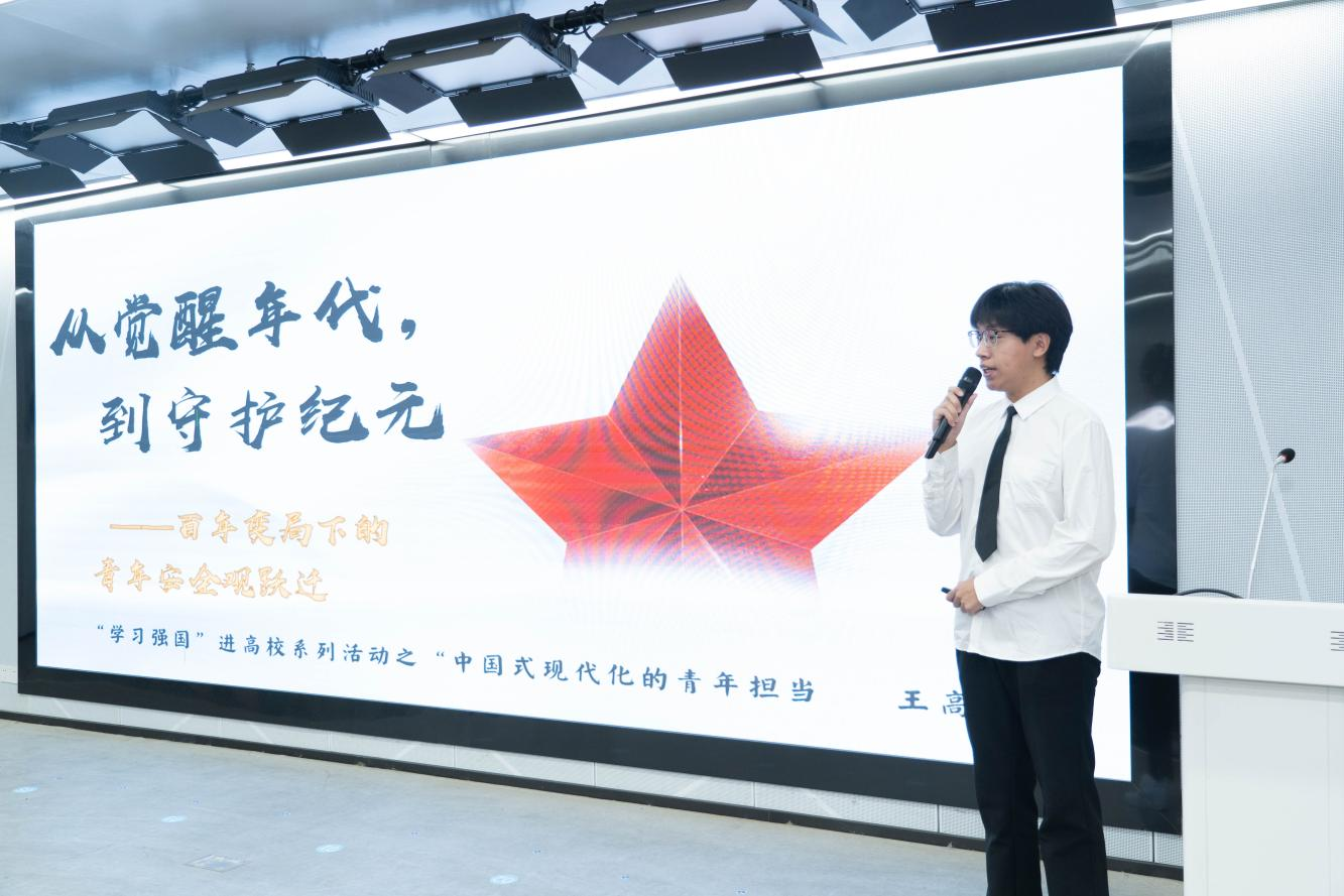随后,围绕“中国式现代化的青年担当”这一主题,现场进入精彩的“青声习语”理论宣讲环节。作为今年无锡创新打造的理论宣讲品牌,“青声习语”善用“青言青语”,让党的创新理论“声”入人心。来自我校和新安街道的青年代表,分享了自己的学习感悟和思考,从不同角度阐述了中国式现代化的内涵和青年一代的责任担当,引导广大青年深学细悟笃行,引发在场师生的强烈共鸣。我校集成电路学院丁春祺同学、商学院王高冉同学分别以《传承江抗鱼水情 青春聚力为人民》《从觉醒年代到守护纪元——百年变局下的青年安全观跃迁》为题,结合个人实际和学习感悟作了精彩分享。