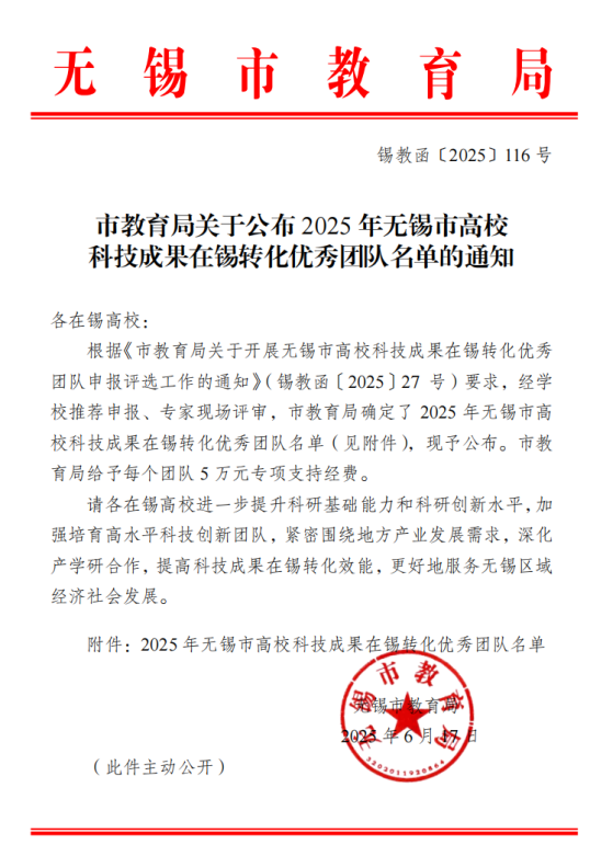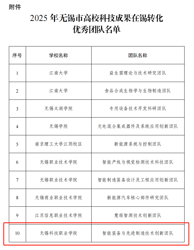 近日,无锡市教育局公布无锡市高校科技成果转化工作评选结果。我校智能制造学院“智能装备与先进制造技术创新团队”凭借突出的科技成果转化成效,获评无锡市高校科技成果转化优秀团队。