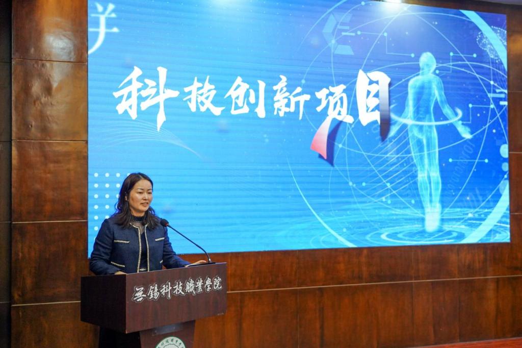 校科技处处长华冬芳宣读本届科技创新节的创新项目名单。