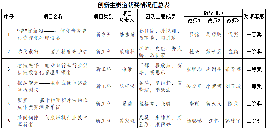 在创新主赛道上,我校“‘粪’忧解难”项目聚焦新农科领域,以循环经济理念破解养殖污染难题,技术实用性强;“芯仪求精”项目深耕新工科赛道,凭借核心技术突破助力国产精度提升,市场潜力显著,两个项目双双拿下一等奖。创意赛道上,文化创意类项目“吴地新农 互联共生”深挖本土文化内涵,以新颖设计理念荣获一等奖。创业主赛道中,商业类项目“陆子也”以特色运营模式和社会责任担当斩获一等奖,新农科项目“智耘匠造”则凭借接地气的乡村振兴解决方案获评一等奖。老字号创新设计赛道中,“窑变奇谭”项目通过数字设计赋能传统老字号,凭借文化与科技的深度融合摘得一等奖。
