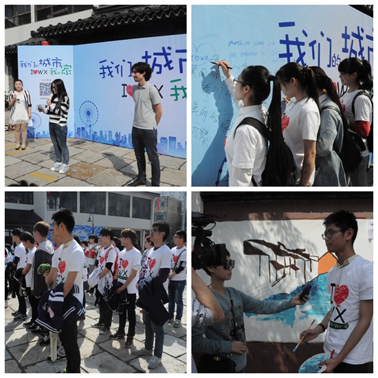 此次活动吸引了无锡市多家媒体前来采访。我校蒋鹏同学接受采访时表示环境对于城市的重要性,同时也详细地介绍了自己所设计的这幅涂鸦的构成和含义,希望越来越多的人都能够保护环境,珍惜资源。