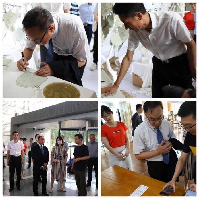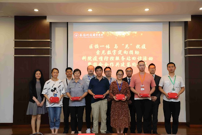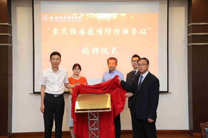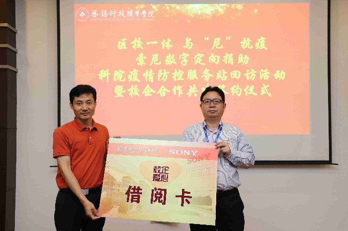 仪式中,双方举行了党建联盟签约、人才合作签约。在场领导共同为“索尼校园疫情防控服务站”进行了揭牌,索尼领导还为师生代表发放了健康防疫包,学校回赠了企业“爱心读书借阅卡”,走访参观了校园相关场地和毕业生设计作品展。