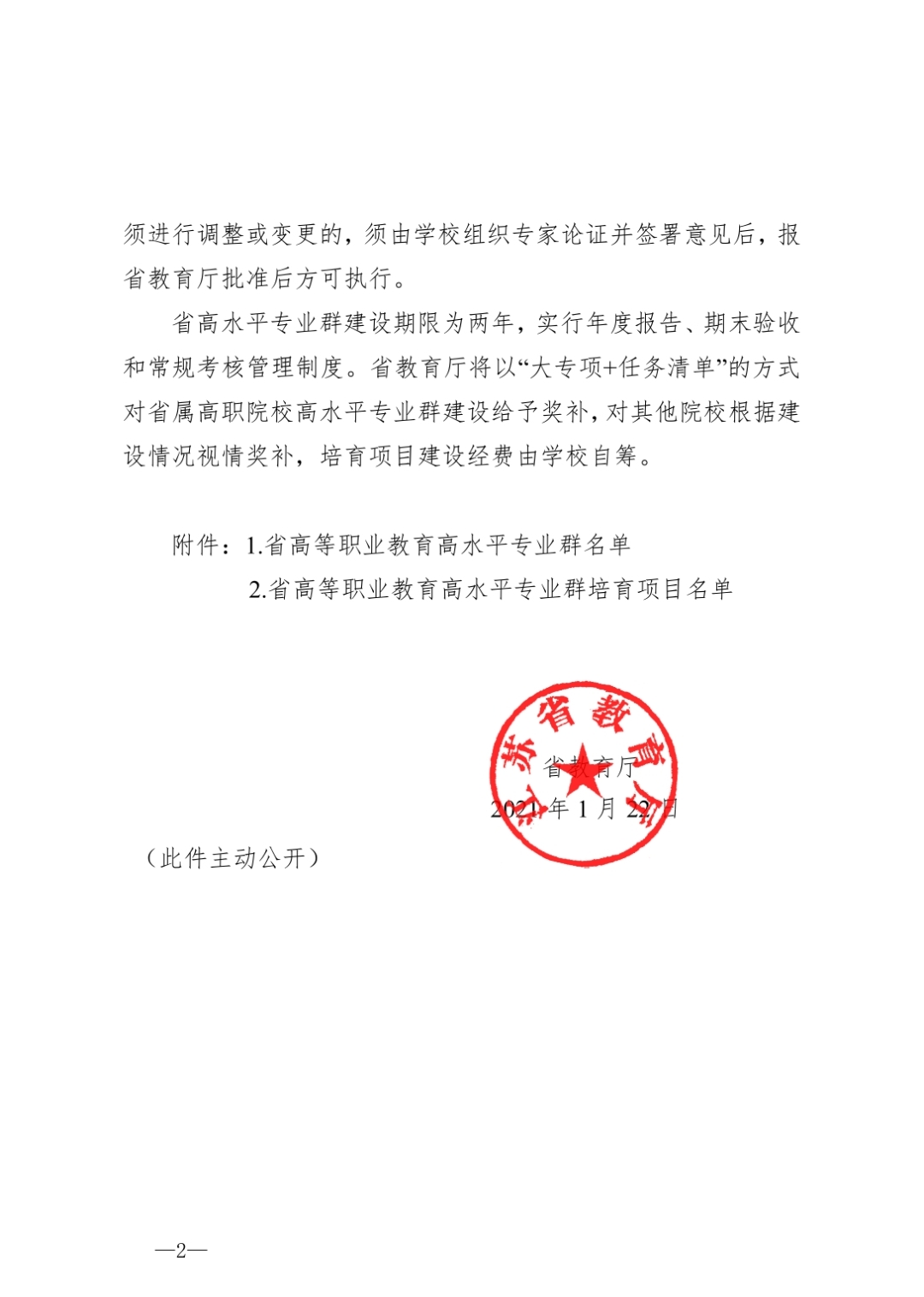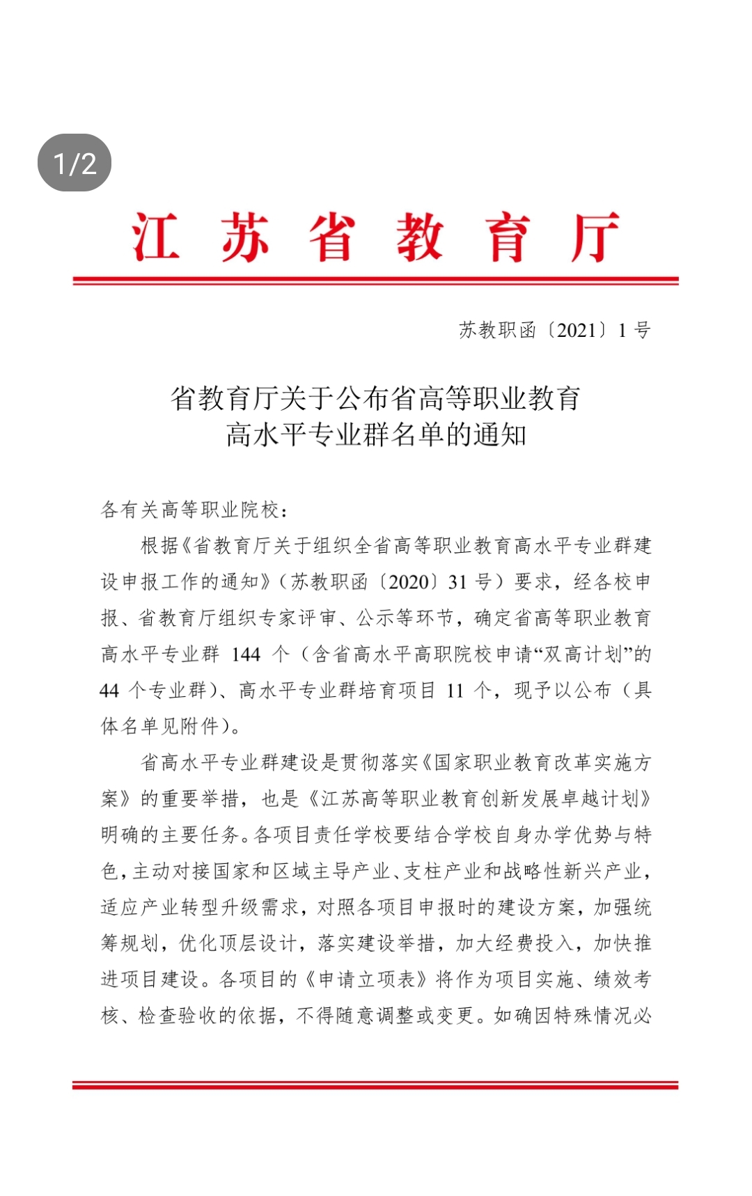 为进一步落实《国家职业教育改革实施方案》和《江苏高等职业教育创新发展卓越计划》,省教育厅启动了高水平专业群建设,引导各校对接国家和区域产业发展,提升专业建设水平和质量。除已申请“双高计划”的44个专业群外,此次全省共评选出100个高水平专业群。我校能在其中占有两席,是对近年来内涵建设和特色发展的极大肯定和鼓舞。