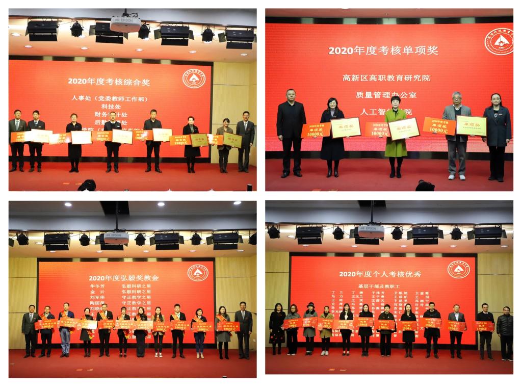 大会对在学校2020年度各项工作中作出突出贡献的先进单位和个人进行了表彰。人事处(党委教师工作部)等6个单位获2020年度考核综合奖,高新区高职教育研究院等3个单位获2020年度考核单项奖,冯贞贞等72名教职工2020年度考核等次为优秀,华冬芳等10名教职工获2020年度弘毅奖教金。在热烈喜庆的气氛中,校领导向受到表彰的单位和个人颁发了荣誉证书和奖金牌。