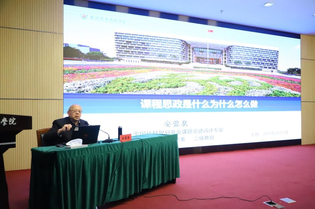 27日下午,为深入贯彻落实全国、全省高校思想政治工作会议精神,推动“课程思政”工作良性发展,学校特邀全国社科规划基金课题党建函评专家、杭州市政府参事、原杭州职业技术学院党委书记安蓉泉教授来校作题为《课程思政是什么,为什么,怎么做》的讲座,为“课程思政”工作“把脉问诊开良方”。校党委中心组全体成员和全校教职工参加了讲座。
