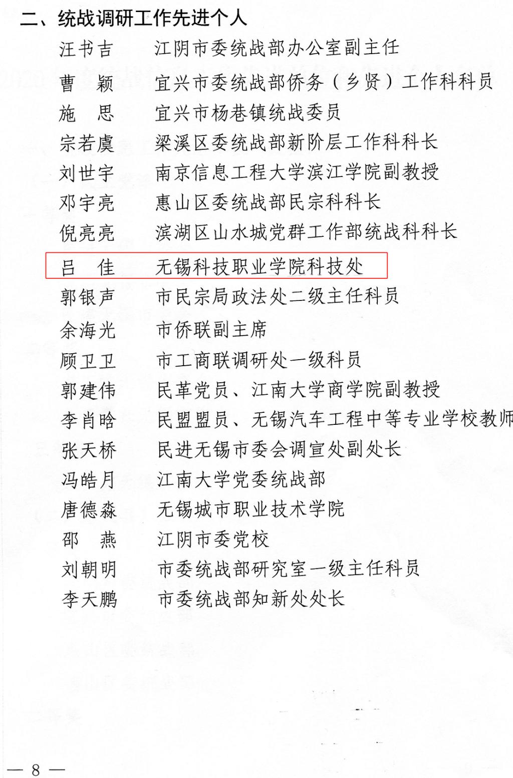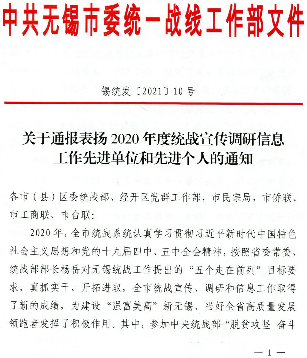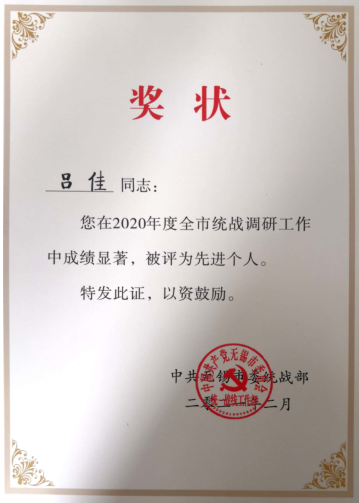 近期,中共无锡市委统战部对全市统战条线宣传调研信息工作先进单位和先进个人进行了表彰,我校吕佳老师获得“2020年度统战调研工作先进个人”荣誉称号。