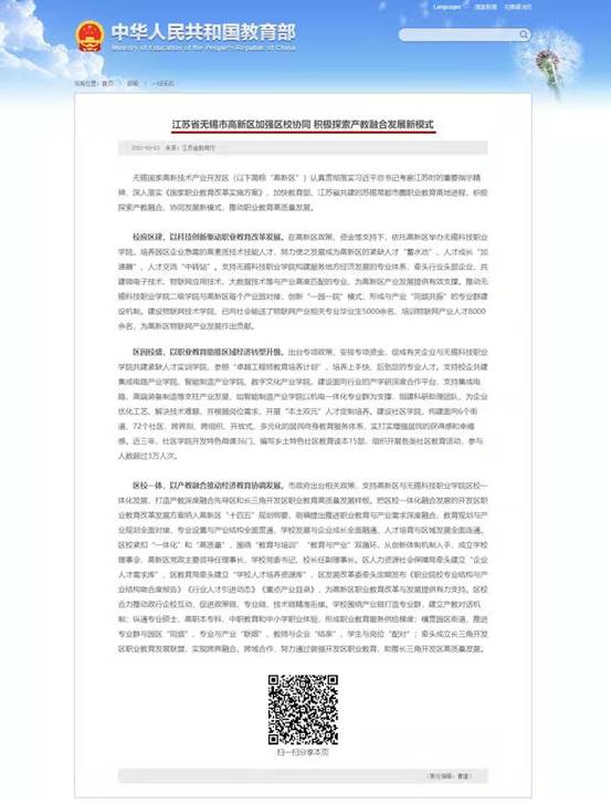 2021年3月23日,教育部网站以《江苏省无锡高新区加强区校协同积极探索产教融合发展新模式》为题,全面报道了区校一体化发展的模式与成效。