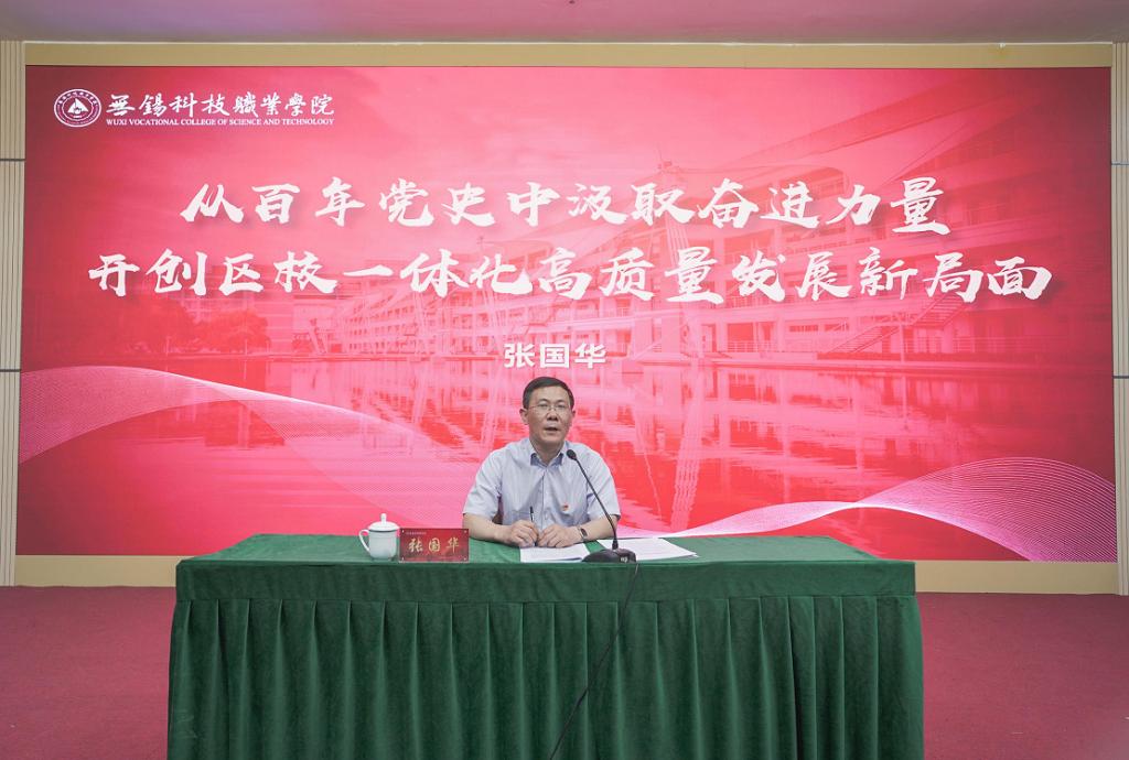张国华强调,全校上下要以党史学习教育为主线,将悟思想、办实事、开新局贯穿办学治校始终,坚定不移地扛起历史责任与使命,团结拼搏、负重奋进、自加压力、敢于争先,高水平服务学生成长成人,高质量服务高新区,加快打造产教深度融合先导区和长三角开发区职业教育高质量发展样板、打造全国高新区高职教育“新吴模式”,办好人民满意高职教育。