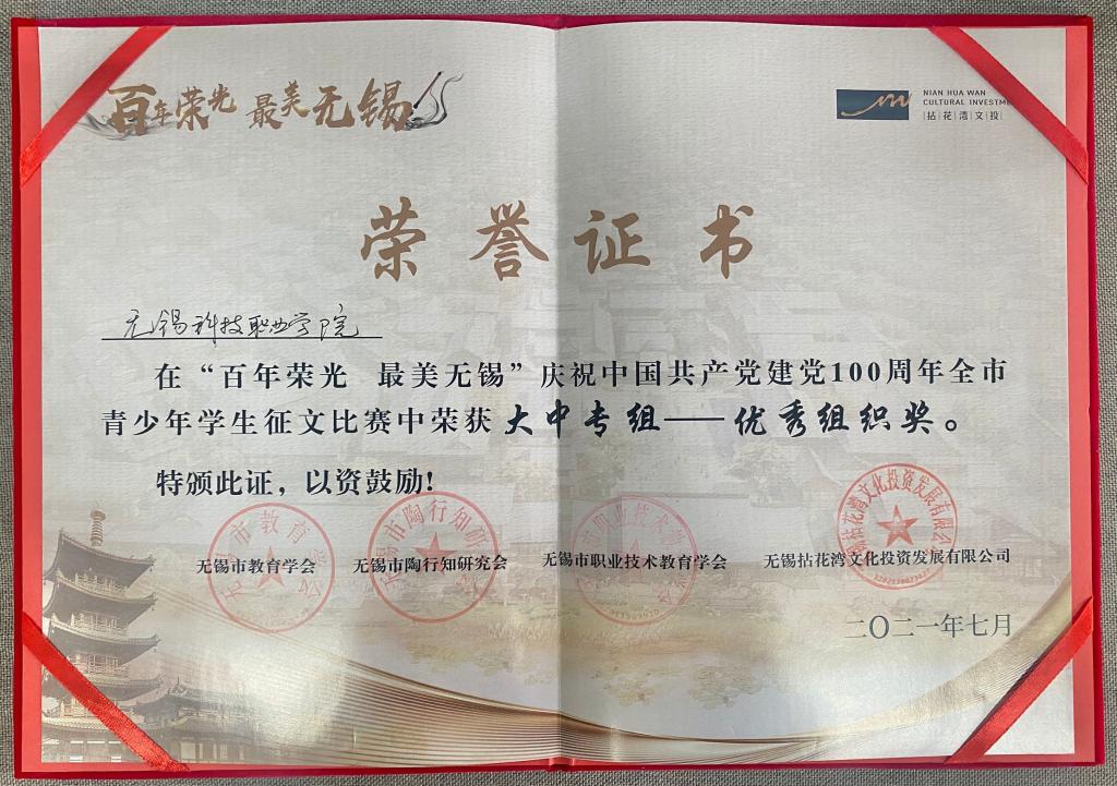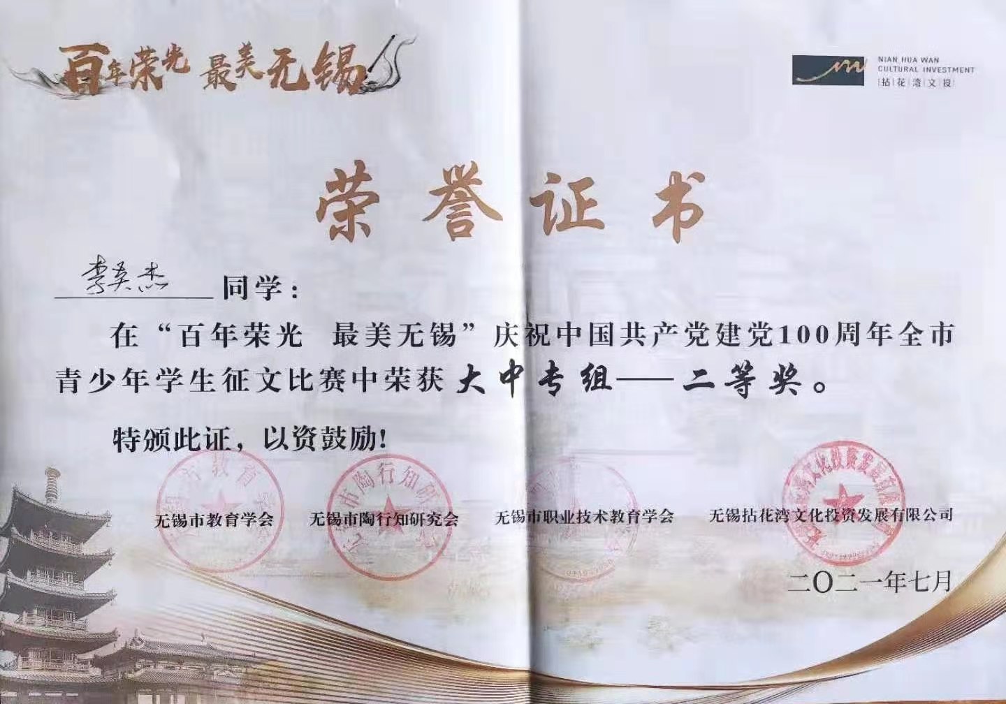 在隆重纪念中国共产党100周年之际,为进一步激发全市中小学、大中专院校学生爱党爱国、热情,做有信仰、有理想、有本领、有担当的新时代青少年,无锡市教育学会、无锡市陶行知研究会、无锡市职业技术教育学会在无锡拈花湾文化投资发展有限公司支持下,面向无锡市青少年学生,举办了以“百年荣光、最美无锡”为主题的庆祝建党100周年主题征文活动。此次征文活动时间为2021年3月23日到5月31日,分为小学组、中学组、大中专院校组。