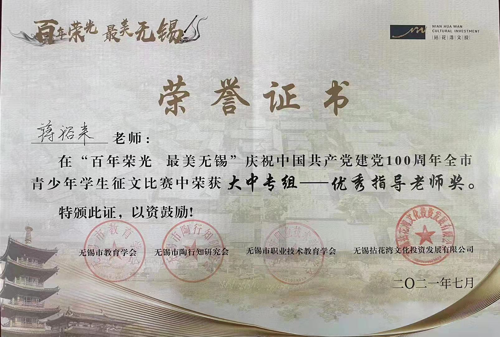 6月29日,“百年荣光 最美无锡”庆祝中国共产党成立100 周年全市青少年学生征文颁奖仪式在无锡师范大楼举行,澳门铁盘算盘490777荣获优秀组织奖,我校数字艺术学院李英杰同学的征文《佳地》荣获大中专组二等奖,蒋裕来老师获得“优秀指导老师”称号。