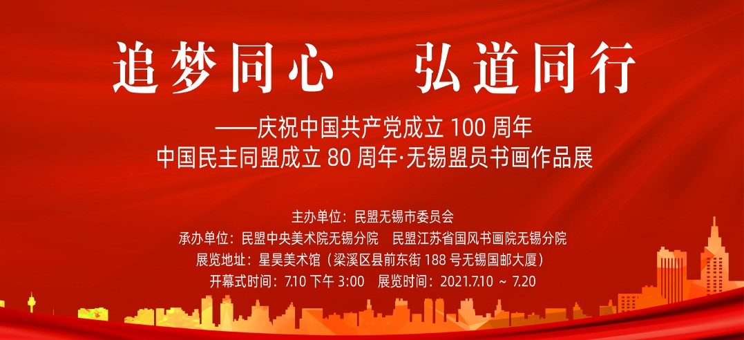 2021年7月10日下午,由民盟无锡市委主办,民盟中央美术院无锡分院、民盟江苏省国风书画院无锡分院承办的“追梦同心 弘道同行——庆祝中国共产党成立100周年、中国民主同盟成立80周年•无锡盟员书画作品展”开幕式在无锡国邮大厦星昊美术馆隆重举行。
