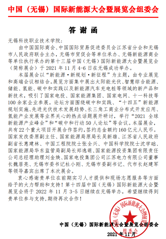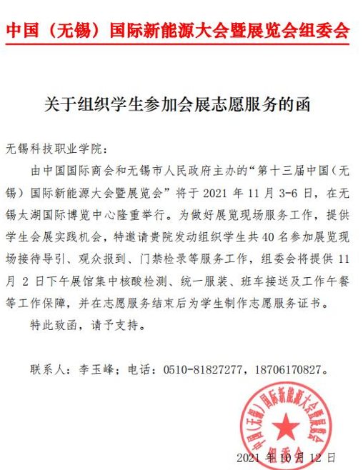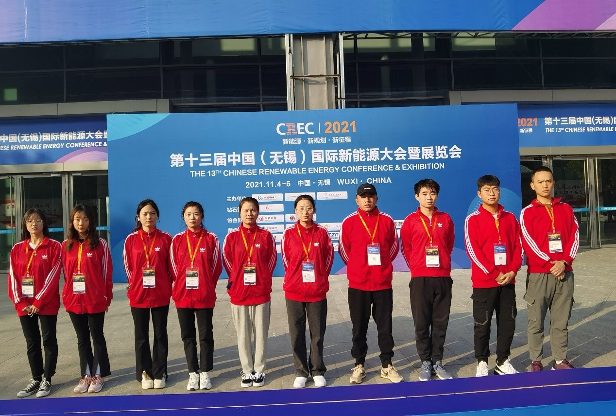 11月3-6日,第十三届中国(无锡)国际新能源大会暨展览会(CREC2021)在无锡太湖国际博览中心线上线下同步举办。本次展会由中国国际商会、无锡市人民政府联合无锡新能源商会主办。自2009年起,在组委会励精图治发展至今,该展会已成为中国光伏行业第三大展会。近几年来,文化旅游学院旅游系和无锡新能源协会一直保持着深度合作,从2013年第五届开始,会展专业的优秀学生均会全程参与此次项目,并通过了《澳门铁盘算盘490777紧密型合作企业认定》。今年,我校文旅学院也选派了4名学生从7月份开始全程参与新能源展会筹备和会务工作,并安排了40名学生参与志愿者服务。
