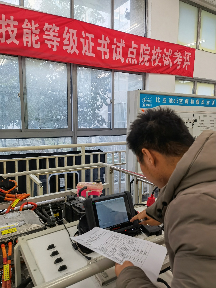 学校于12月26日进行了“智能新能源汽车”1+X职业技能等级证书中[新能源汽车电子电气与空调舒适系统技术(中级)]模块的考评。学生在完成“书证融通”的《新能源汽车电气系统检修》《新能源汽车空调与舒适系统检修》16周授课任务和短暂的考务培训后直接参加考评,通过率达到了100%。