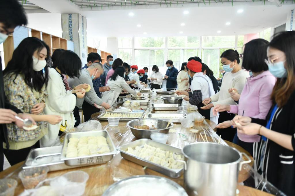 教职工们欢聚一堂,秀手艺,展身手,聊工作,诉心声,欢声笑语,协力互助。一盘盘让人垂涎欲滴的馄饨、饺子呈现眼前,融融暖意洋溢流淌。晚餐中,教职工们欣喜地品尝了自己的劳动成果,体味了满满的“家的味道”。