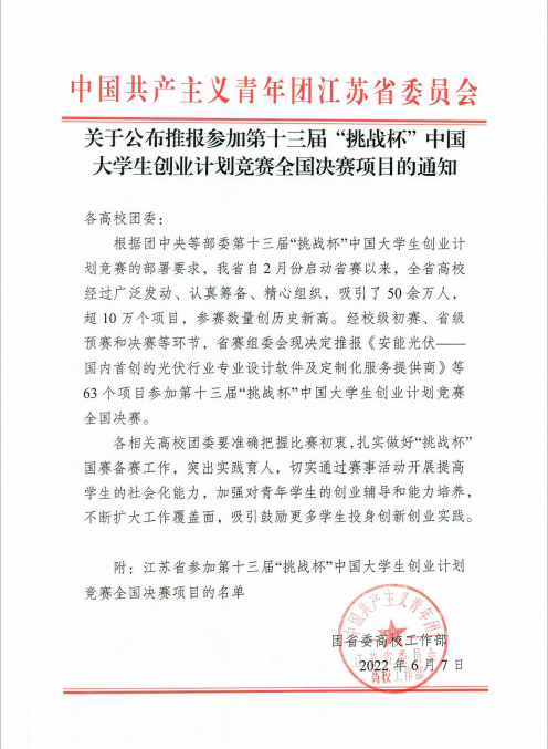 “挑战杯”江苏省大学生创业计划竞赛是一项具有导向性、示范性、实践性和群众性的创业交流活动,每两年举办一届。竞赛由共青团江苏省委、江苏省教育厅、江苏省人力资源和社会保障厅、江苏省科学技术协会、江苏省学生联合会和盐城市人民政府主办。本届 “挑战杯”全省218所高校的662件作品进入省赛,其中高职91个项目,最终全省高职共有13个项目入围国赛。