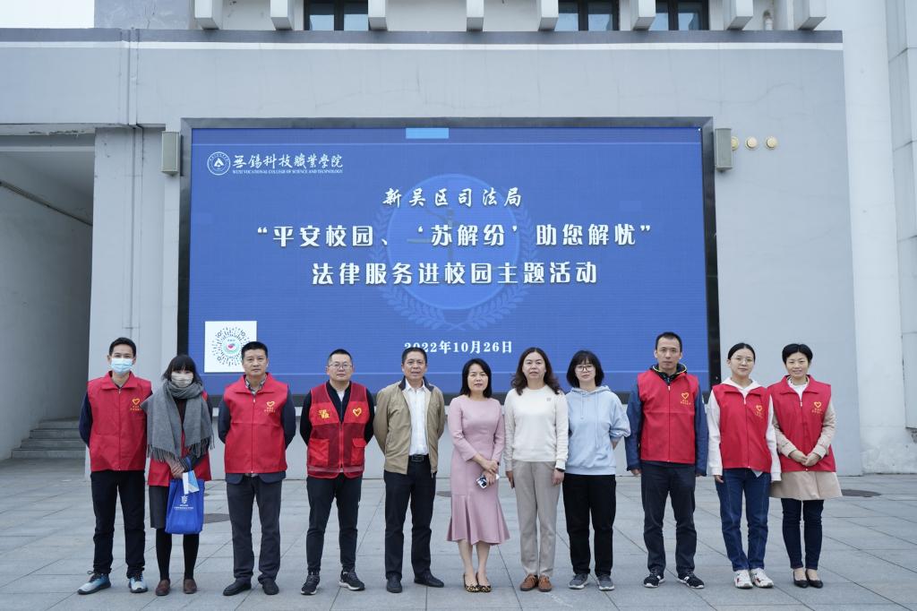 为弘扬宪法精神,践行法治理念,增强师生法治意识,10月26日,我校联合新吴区司法局开展了“平安校园、‘苏解纷’助您解忧”法律服务进校园主题活动。校党委委员、宣传统战部部长赵娴、新吴区司法局副局长黄娅出席此次活动。
