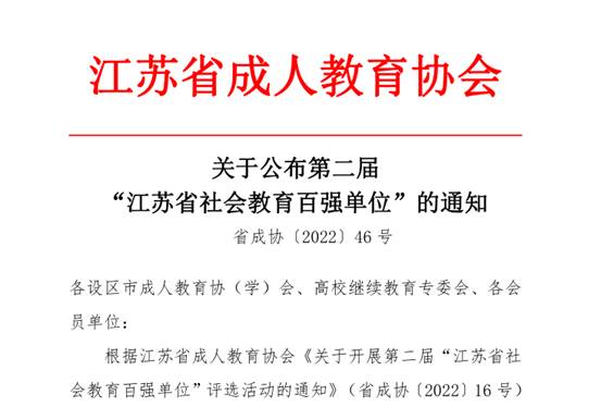 11月22日,江苏省成人教育协会公布了第二届“江苏省社会教育百强单位”评选结果,入选的本科及高职学校共13所,我校继续教育学院名列其中。