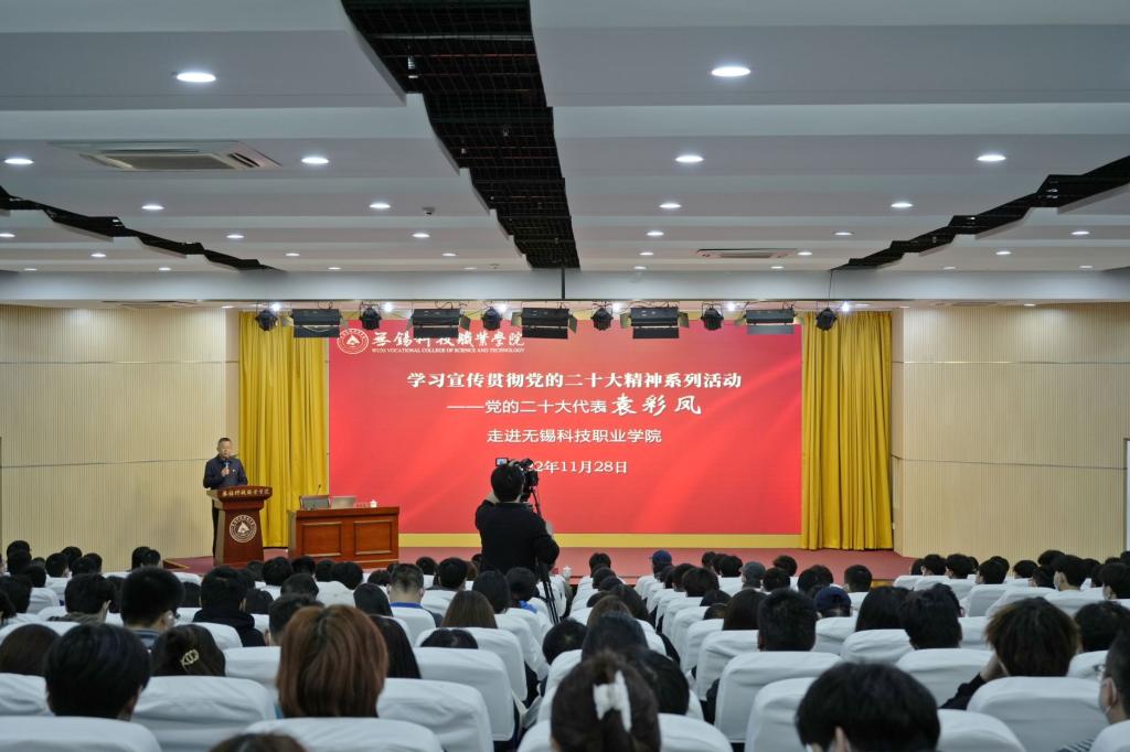 11月28日下午,我校在博文楼报告厅举办“党的二十大代表进校园”活动,特邀党的二十大代表、电装天电子(无锡)有限公司党支部书记袁彩凤来校作党的二十大精神宣讲报告。校领导,各党总支书记,全体马克思主义学院老师,各二级学院师生代表和宿管、保安、物业代表现场收听报告。各二级学院设分会场,组织师生收听报告。报告会由校党委副书记华裕良主持。