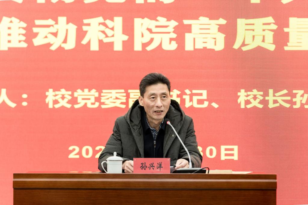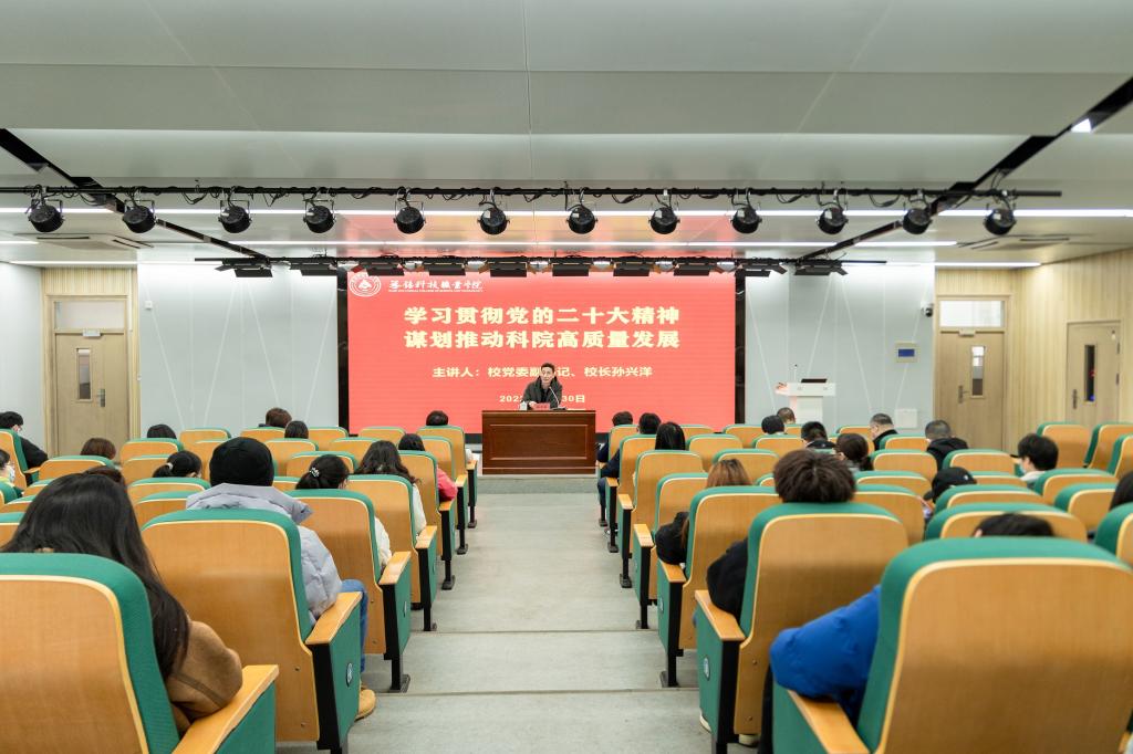 11月30日下午,校党委副书记、校长孙兴洋以《学习贯彻党的二十大精神 谋划推动科院高质量发展》为题在博艺楼报告厅作党的二十大精神专题党课。学校纪委办公室、人事处、财务处、服务新区办公室、高新区高职教育研究院党员干部,商学院全体党员干部教师、学生干部及入党积极分子代表约100人参加了学习。