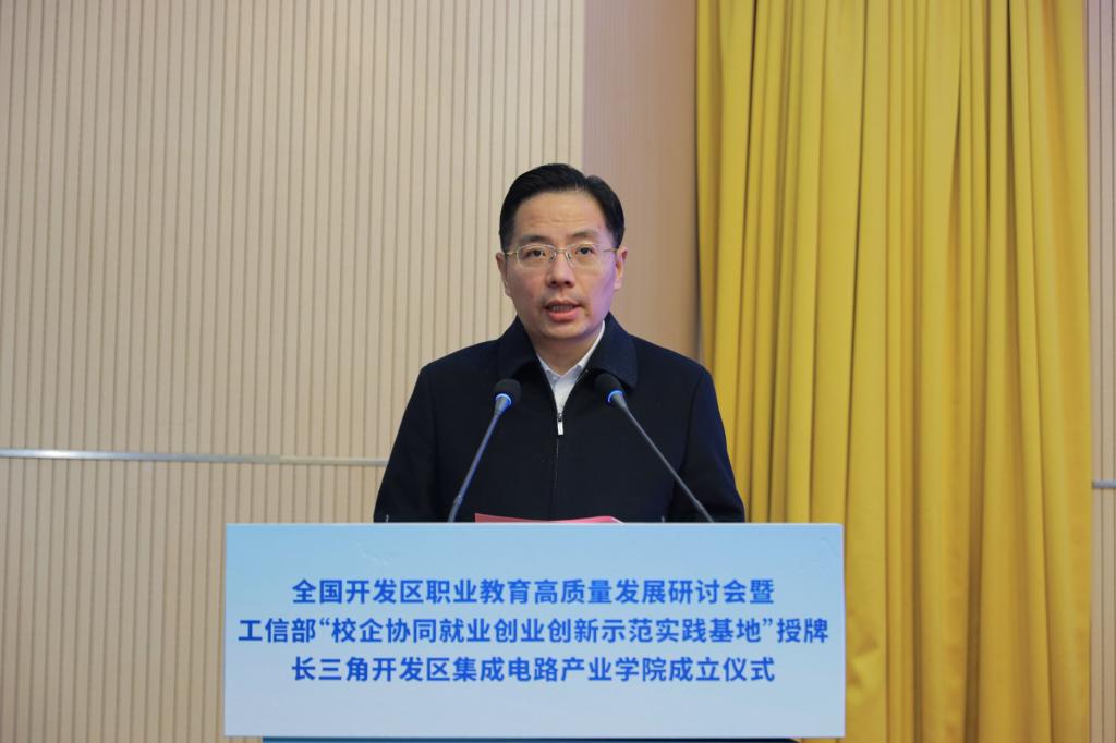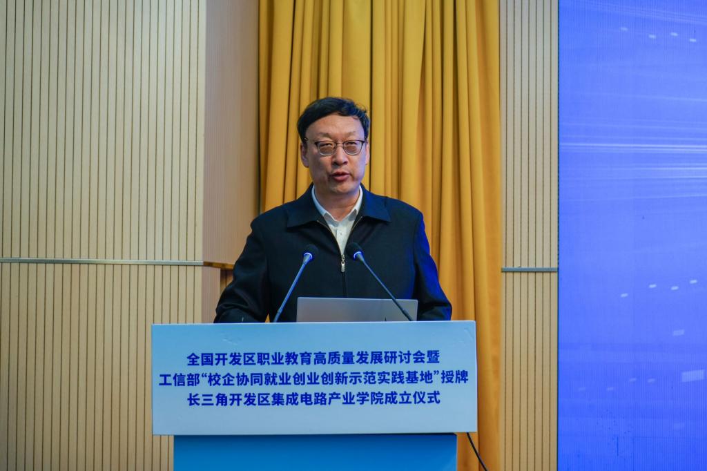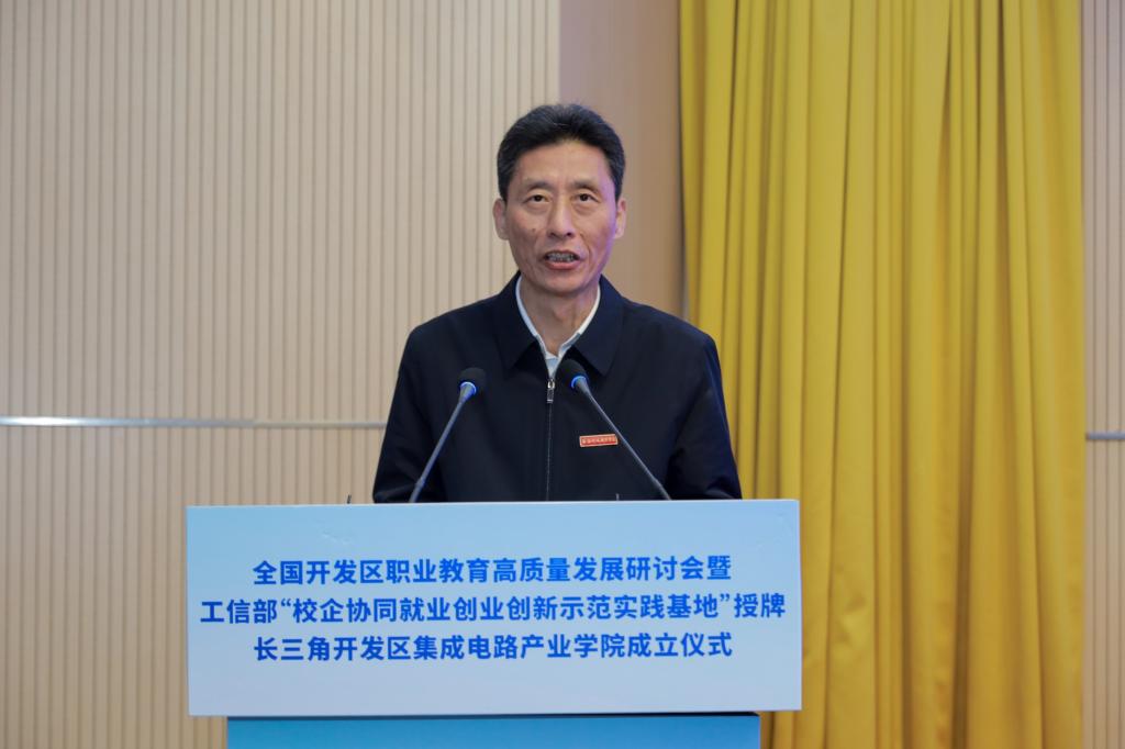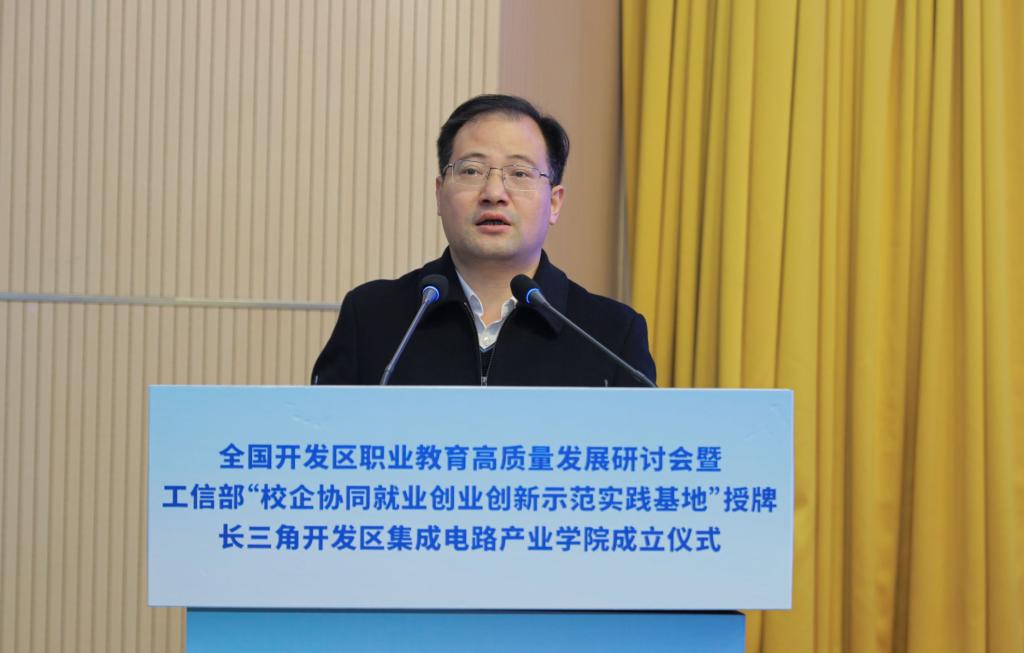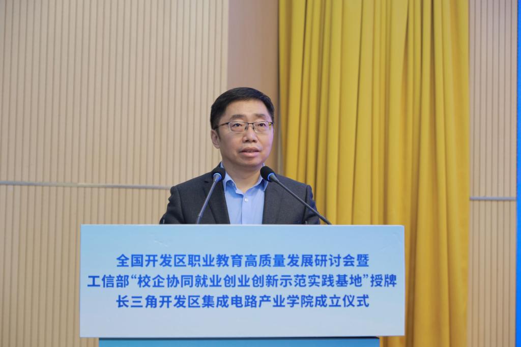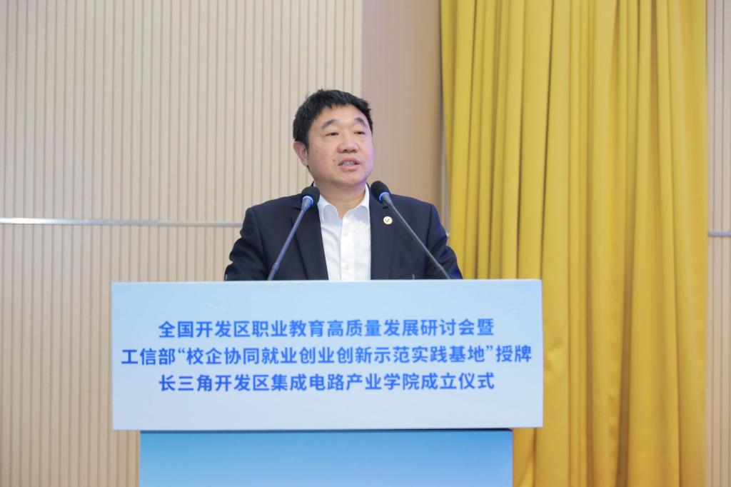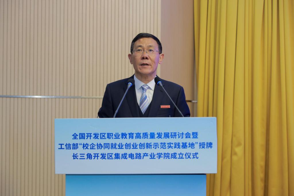 为深入贯彻党的二十大精神,落实《中华人民共和国职业教育法》,推进职普融通、产教融合、科教融汇,促进开发区职业教育高质量发展,全国开发区职业教育高质量发展研讨会暨工信部中小企业发展促进中心“校企协同就业创业创新示范实践基地”授牌、长三角开发区集成电路产业学院成立仪式,近日在我校博文楼报告厅隆重举行,全国开发区职业教育发展联盟同时成立。