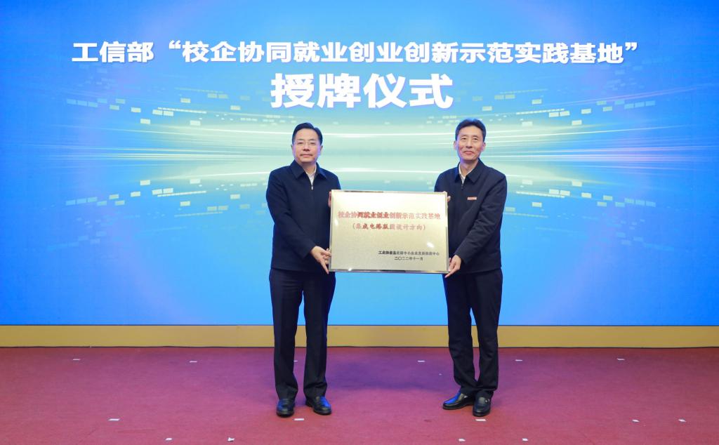 崔荣国受单立坡委托,为学校工信部中小企业发展促进中心“校企协同就业创业创新示范实践基地”授牌。