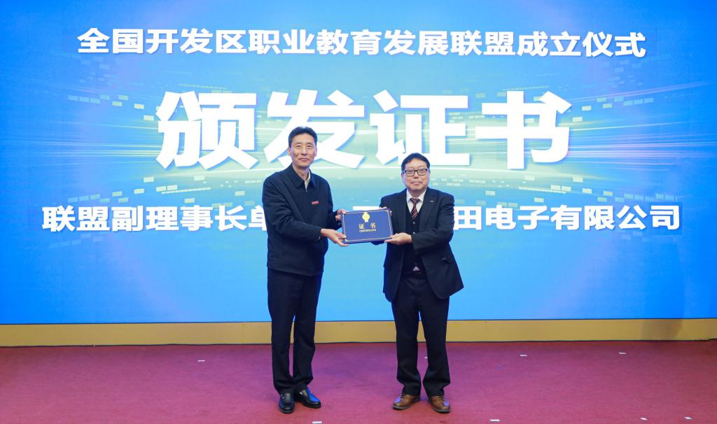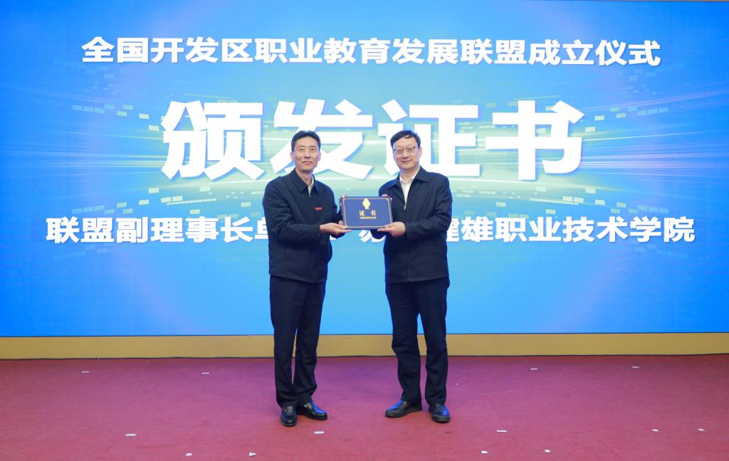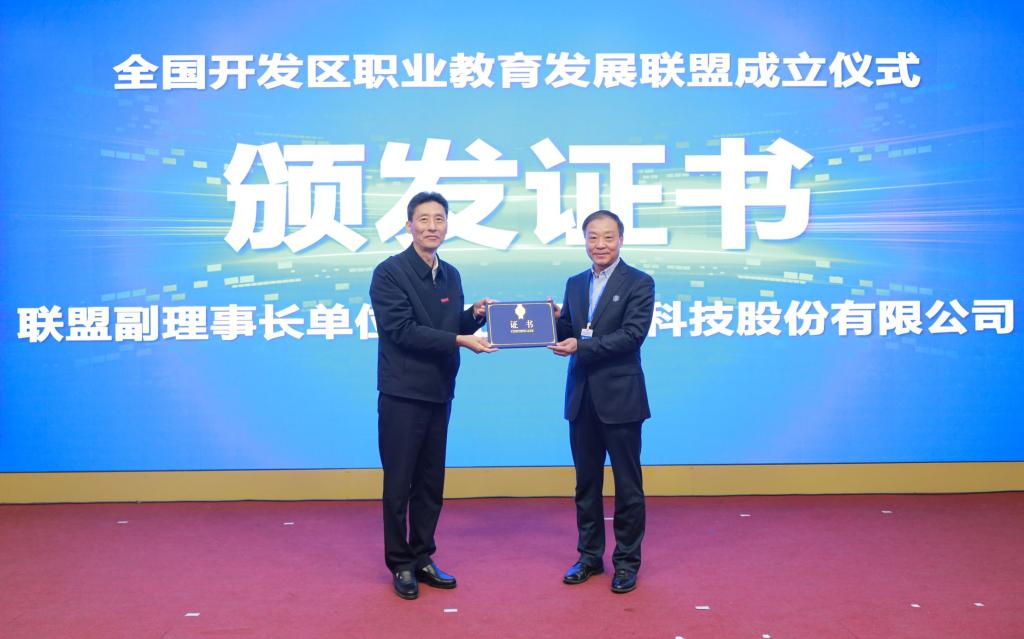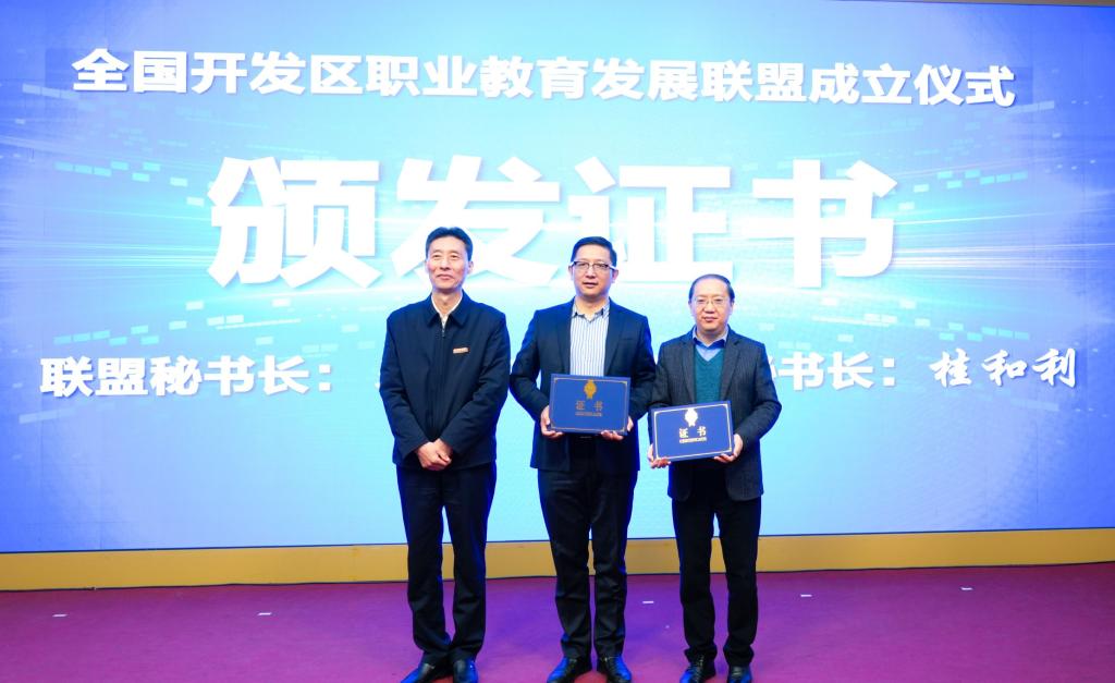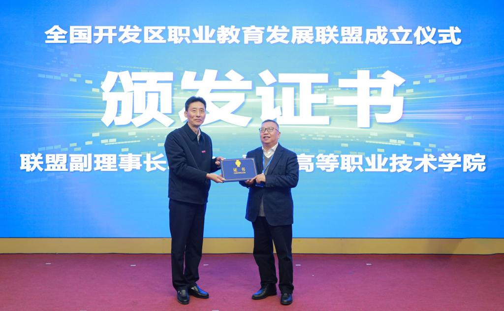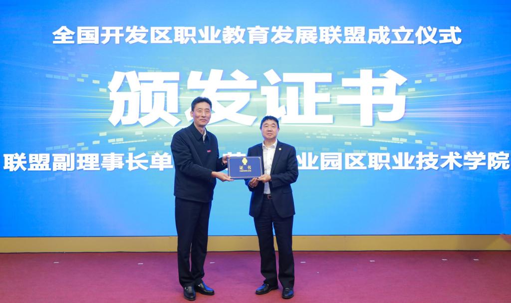 薛茂云代表中国高等教育学会职业技术教育分会对全国开发区职业教育发展联盟的成立表示热烈祝贺,并为联盟理事长颁发证书。