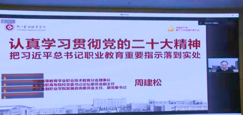 在专题报告阶段,特邀中国高等教育学会职业教育分会理事长周建松以《认真学习贯彻党的二十大精神,把习近平总书记重要指示落到实处》为题作主题报告。苏州工业职业技术学院教授单强,全国职业高等院校校长联席会议秘书长任君庆,中国教育科学研究院博士后、高职计算机和电子商务委员会常务理事宗诚,辽宁省职业技术教育学会副会长高鸿分别作《创新发展职业教育,扎根服务园区经济》《立足开发区办学,助推区域高质量发展》《关于深入推进“产教科”深度融合的思考》《技术变革与数字革命背景下的职业教育创新发展》专题报告。