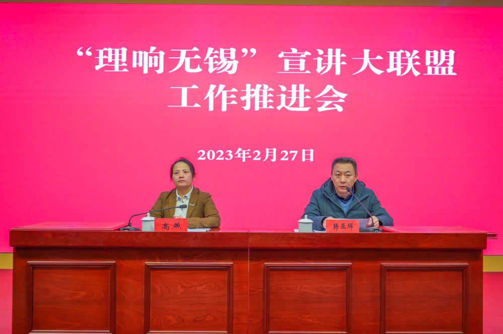 2月27日下午,无锡市“理响无锡”宣讲大联盟工作推进会在我校博文楼报告厅举行。市委宣传部副部长高燕、市委宣传部理论处处长韩亚辉、市委讲师团团长王铭涛、我校党委副书记华裕良和宣讲大联盟讲师团80余位成员代表共同出席会议。会议旨在充分发挥“理响无锡”宣讲大联盟优势,深入交流基层特色宣讲经验,进一步深入推进习近平新时代中国特色社会主义思想深入人心,切实把党的创新理论和路线、方针、政策第一时间传递给广大党员干部和基层群众。