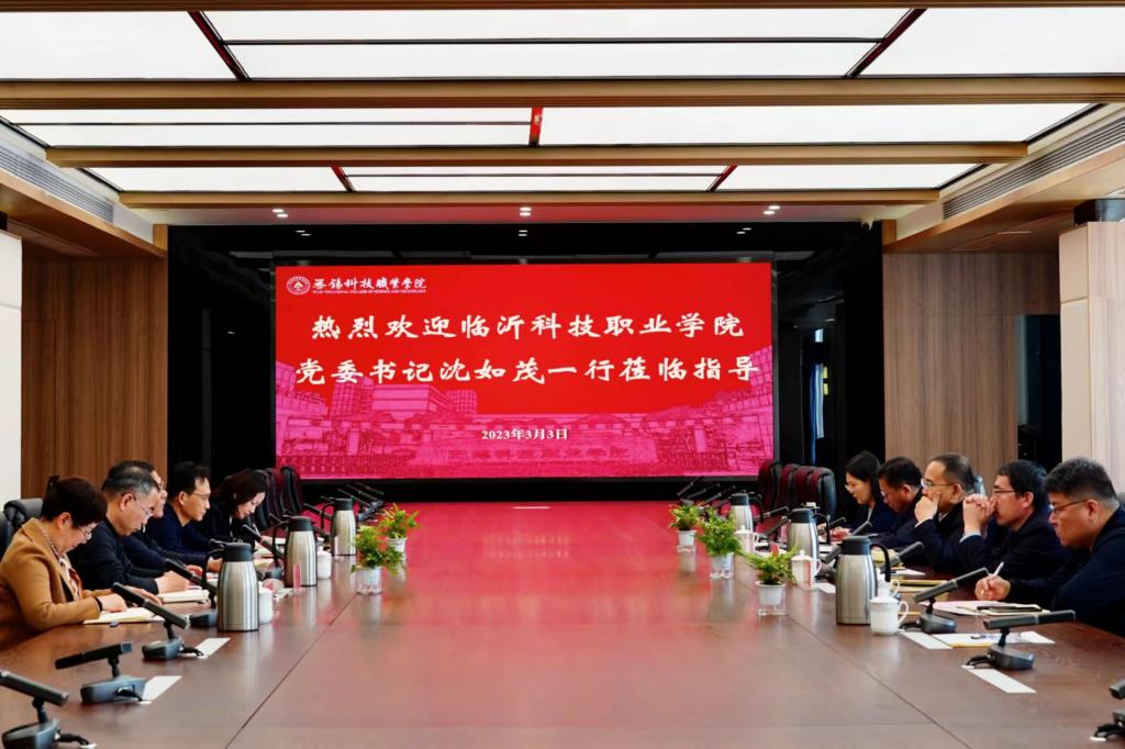3月3日上午,临沂科技职业学院党委书记沈如茂一行来校考察调研,校党委书记张国华在培训中心会议室接待来宾。