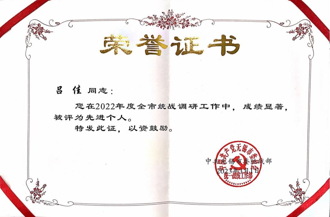 3月1日,中共无锡市委统战部对全市统战条线宣传调研信息工作先进单位和先进个人进行了表彰,我校吕佳老师因在统战调研工作方面成绩突出,三度荣获“全市统战调研工作先进个人”荣誉称号。