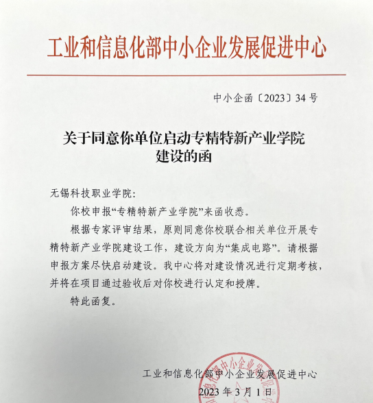 近日,工业和信息化部中小企业发展促进中心公布首批“专精特新产业学院”建设名单,我校成功获批“专精特新产业学院”建设单位。