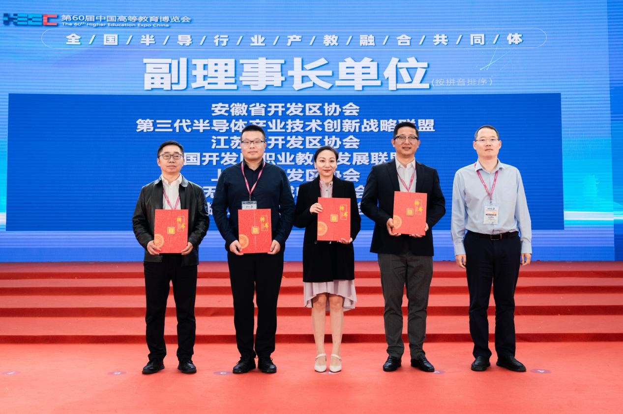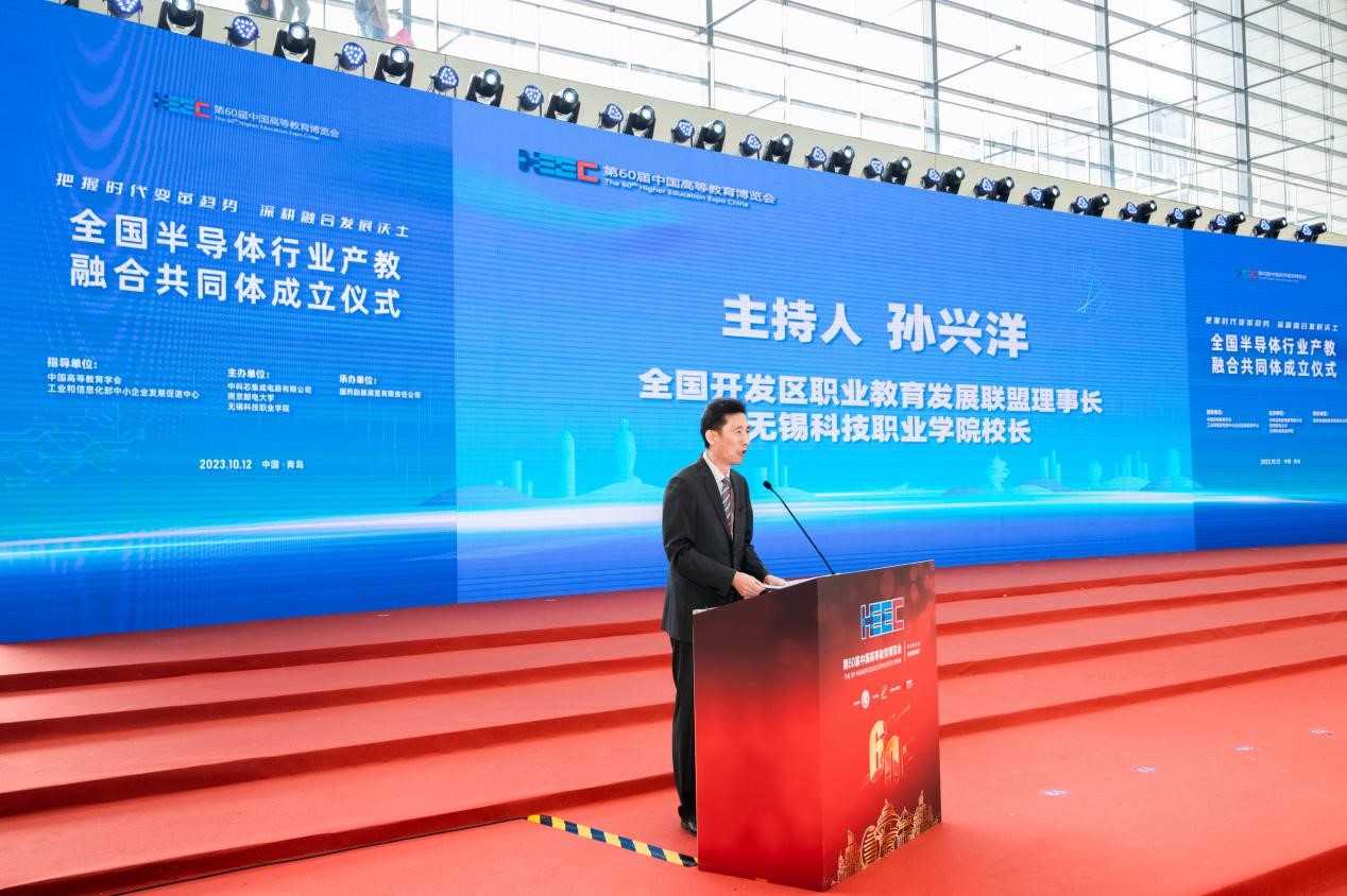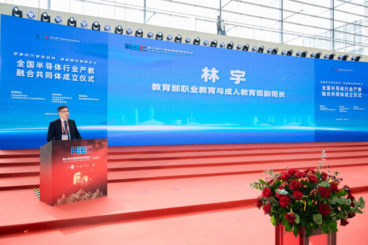 10月12日,作为第60届中国高等教育博览会内容之一,全国半导体行业产教融合共同体成立仪式顺利举办。教育部职业教育与成人教育司副司长林宇,中国高等教育学会副会长、江苏省政协教卫体委员会主任、江苏省教育厅原厅长葛道凯,工业和信息化部中小企业发展促进中心主任单立坡,教育部职业教育发展中心副主任黄辉,中国高等教育学会副秘书长吴英策,工业和信息化部中小企业发展促进中心人力资源发展研究所所长嵇峰,中国半导体行业协会副秘书长刘源超,第三代半导体产业技术创新战略联盟副秘书长冯亚东,中国高等教育学会职业技术教育分会理事长周建松,辽宁省职业技术教育学会常务副会长高鸿,江苏省教育厅高等教育处副处长魏永军,中国教育发展战略学会产教融合专业委员会副理事长兼秘书长李桂云,中国电子科技集团公司首席科学家于宗光,南京邮电大学副校长刘青山,长三角开发区协同发展联盟、上海市开发区协会秘书长杜玉虎,我校党委书记张国华、校长孙兴洋等200余人参加会议。大会由孙兴洋主持。
