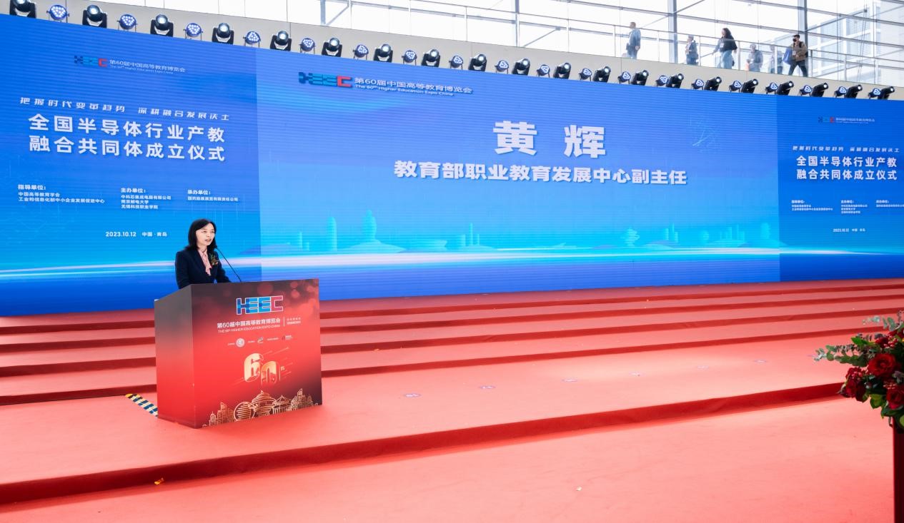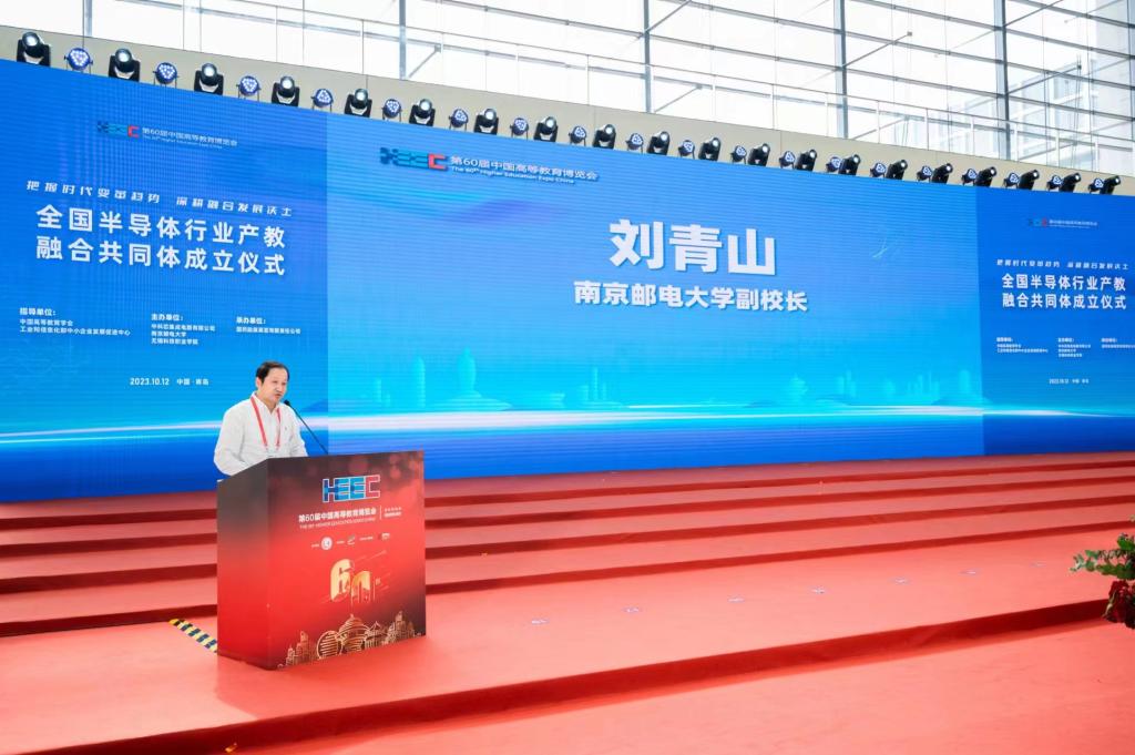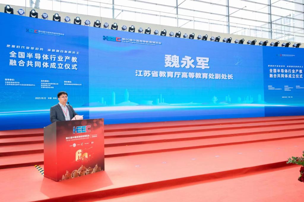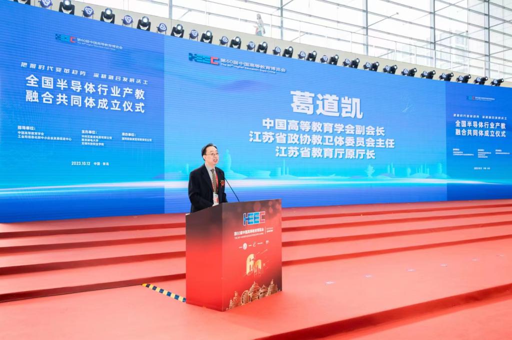 10月12日,作为第60届中国高等教育博览会内容之一,全国半导体行业产教融合共同体成立仪式顺利举办。教育部职业教育与成人教育司副司长林宇,中国高等教育学会副会长、江苏省政协教卫体委员会主任、江苏省教育厅原厅长葛道凯,工业和信息化部中小企业发展促进中心主任单立坡,教育部职业教育发展中心副主任黄辉,中国高等教育学会副秘书长吴英策,工业和信息化部中小企业发展促进中心人力资源发展研究所所长嵇峰,中国半导体行业协会副秘书长刘源超,第三代半导体产业技术创新战略联盟副秘书长冯亚东,中国高等教育学会职业技术教育分会理事长周建松,辽宁省职业技术教育学会常务副会长高鸿,江苏省教育厅高等教育处副处长魏永军,中国教育发展战略学会产教融合专业委员会副理事长兼秘书长李桂云,中国电子科技集团公司首席科学家于宗光,南京邮电大学副校长刘青山,长三角开发区协同发展联盟、上海市开发区协会秘书长杜玉虎,我校党委书记张国华、校长孙兴洋等200余人参加会议。大会由孙兴洋主持。